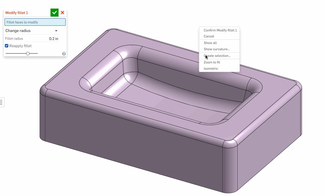 Fillet will select all the faces on a part that are either the same size, greater, or less than (depending on selections). This is useful when modifying imported geometry to either resize or remove fillets.