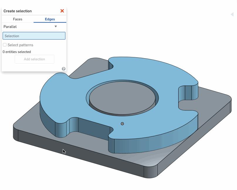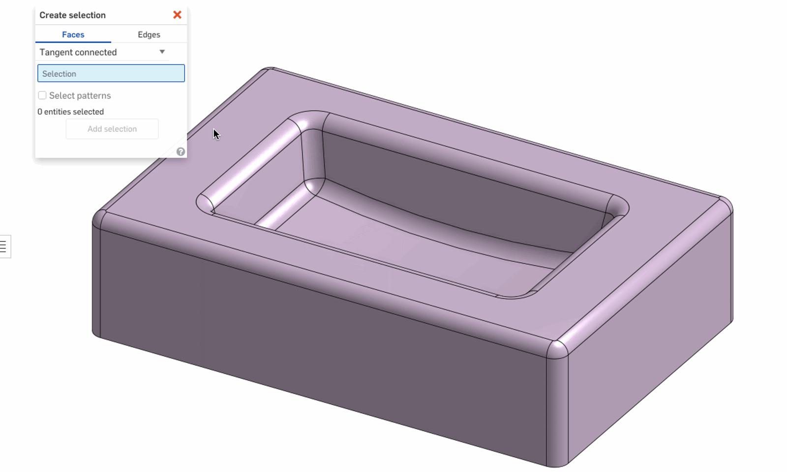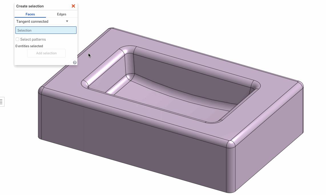 The dialogue allows you to choose Faces or Edges at the top and there is a droplist for the different ways those entities could be interrelated. Once you are done with the selection, you can press the Add Selection button at the bottom to add them to the current feature or pre-selection prior to a feature. Each selection option is described below in more detail.