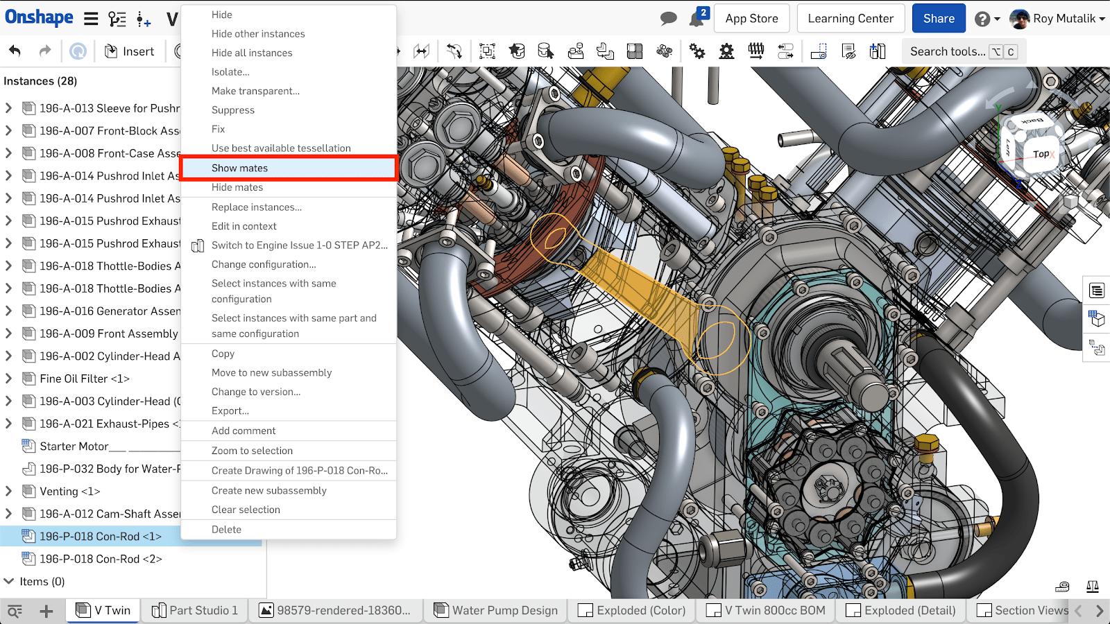 In a recent Onshape release, a new feature was added that allows you to dynamically hide and show mates on screen. This can be used to find the right mate between two parts.
