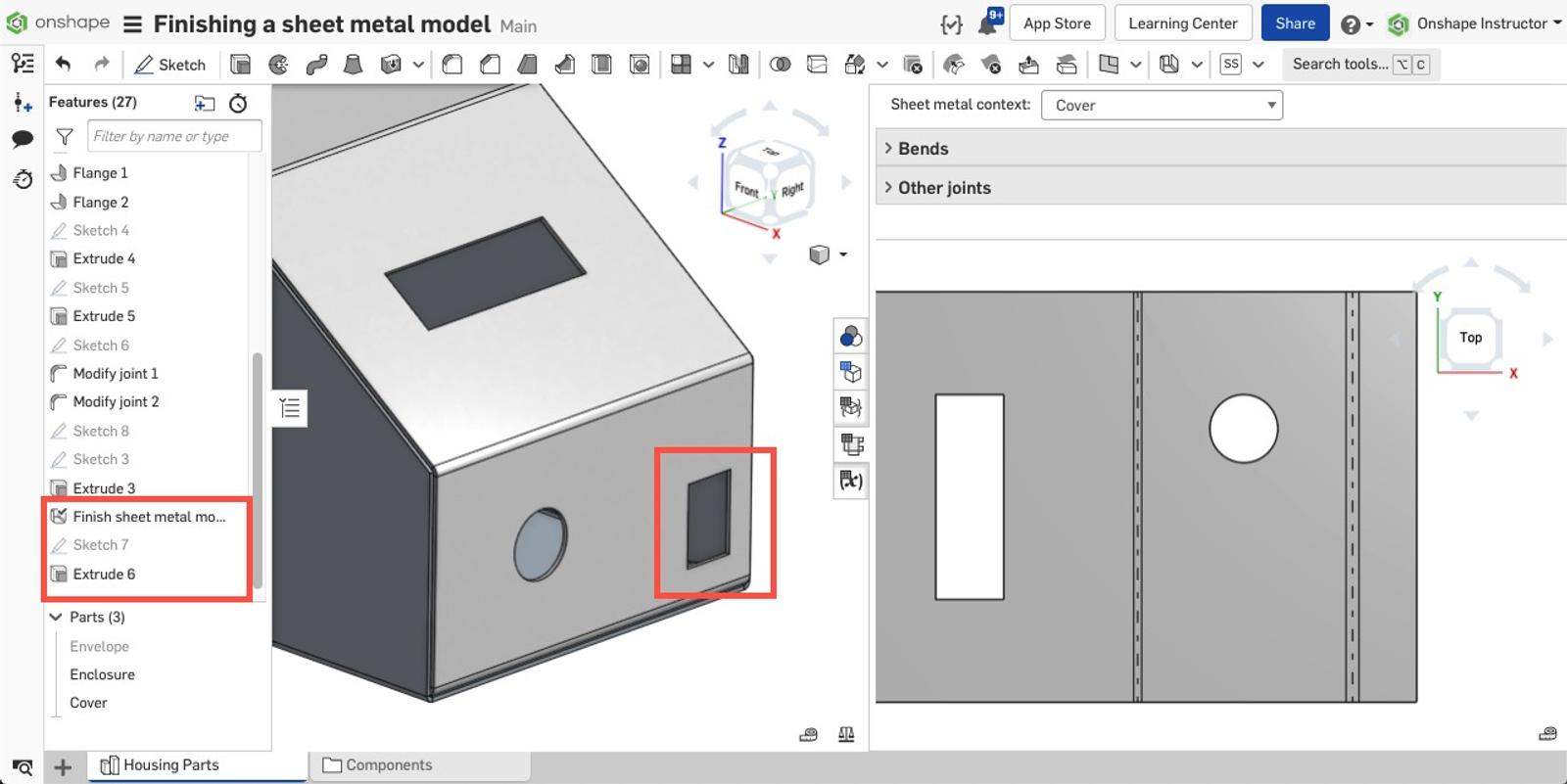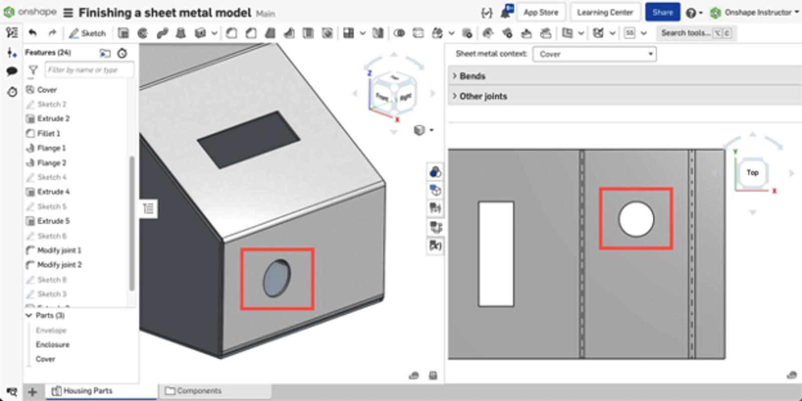 To prevent this cutout from appearing in the flat view, apply the Finish Sheet Metal Model feature and select the cover.