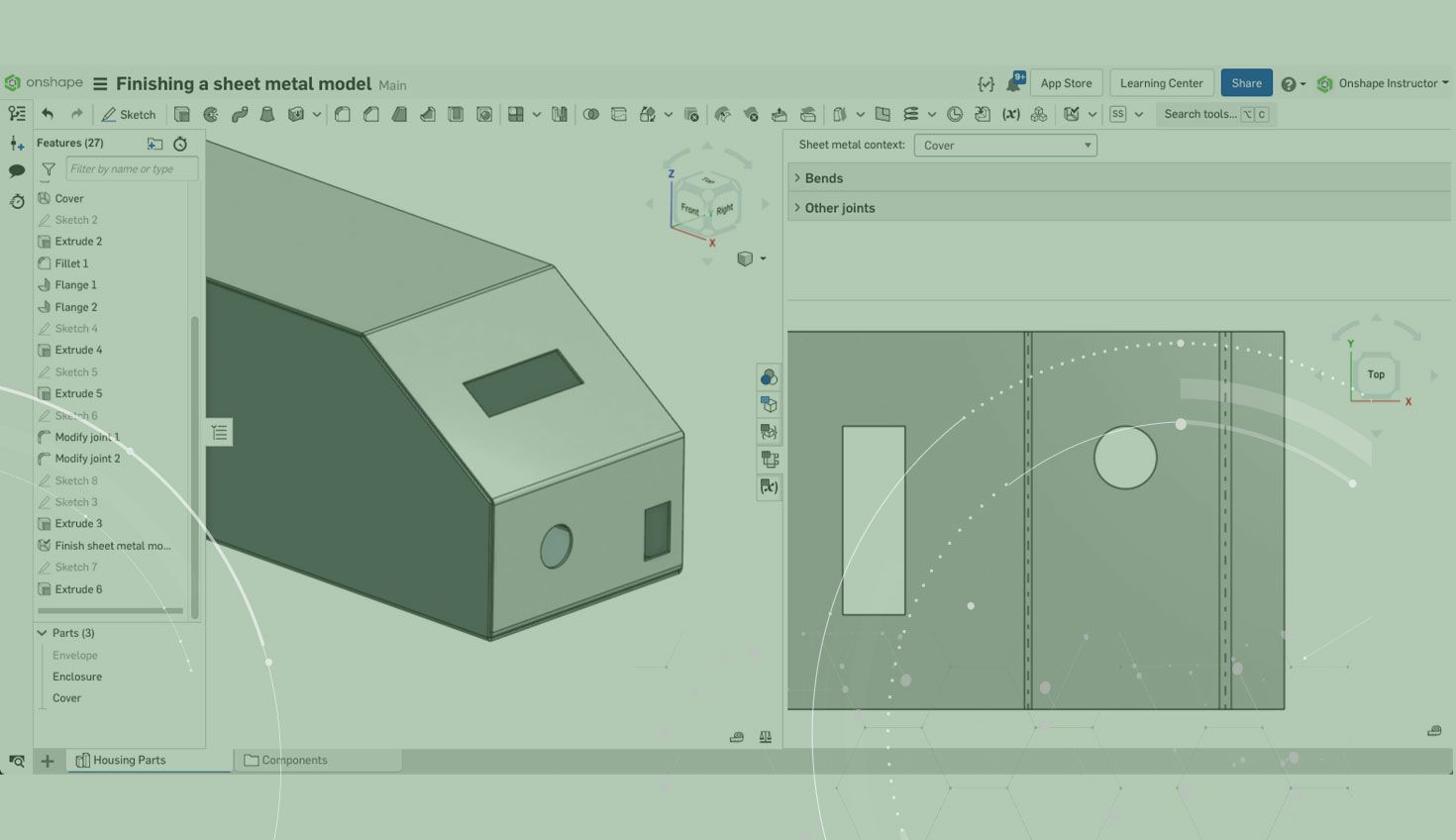 When working with sheet metal, as features are added, the folded and flat views update automatically. Certain features are available and may have limitations such as counterbore and countersink holes.