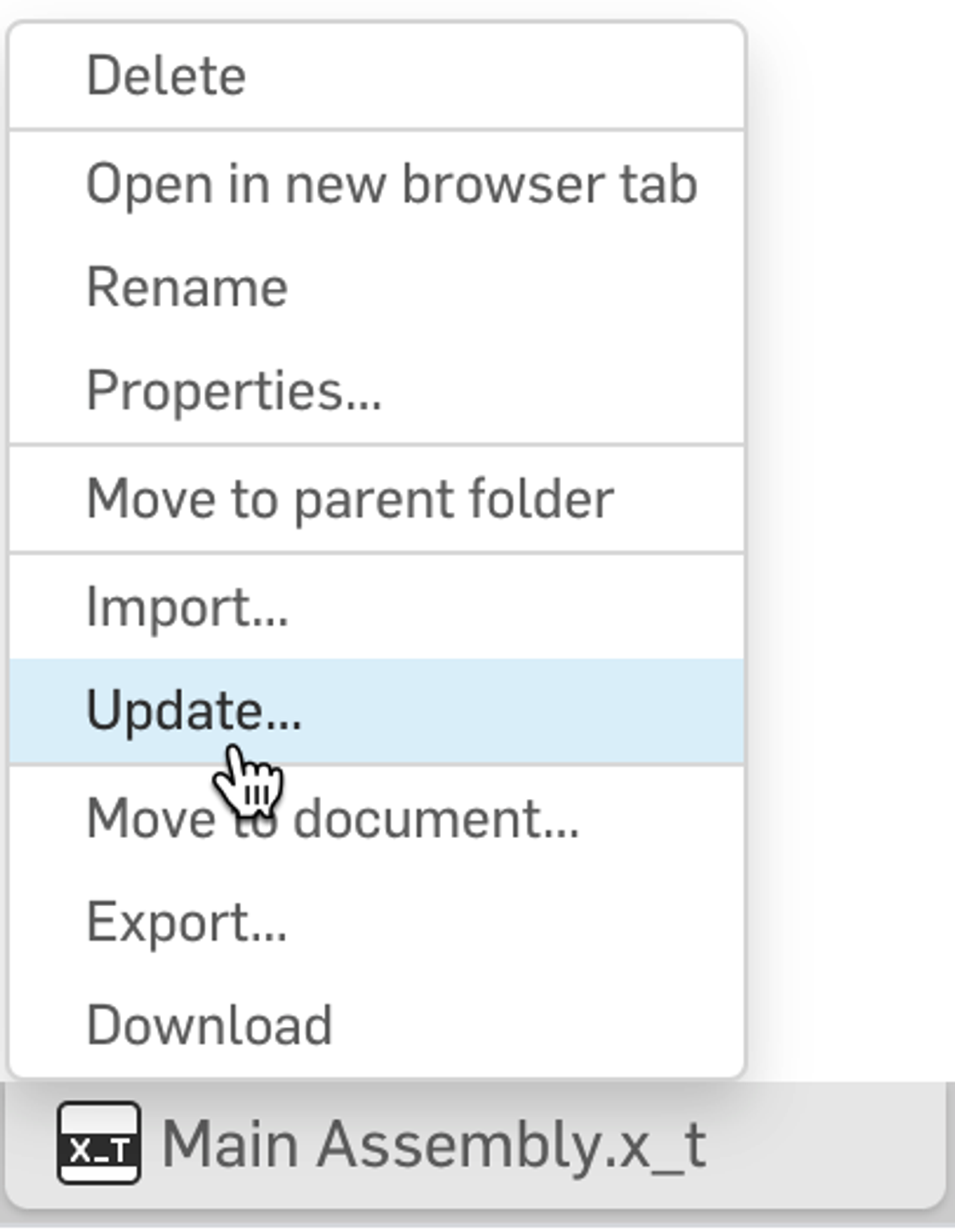 It is common to have imported models as a part of your Part Studios or assemblies. If you are collaborating with an outside team that isn’t using Onshape, they may send you periodic updates. If the imported model hasn’t changed significantly, Onshape will attempt to retain references when you choose the Update action.