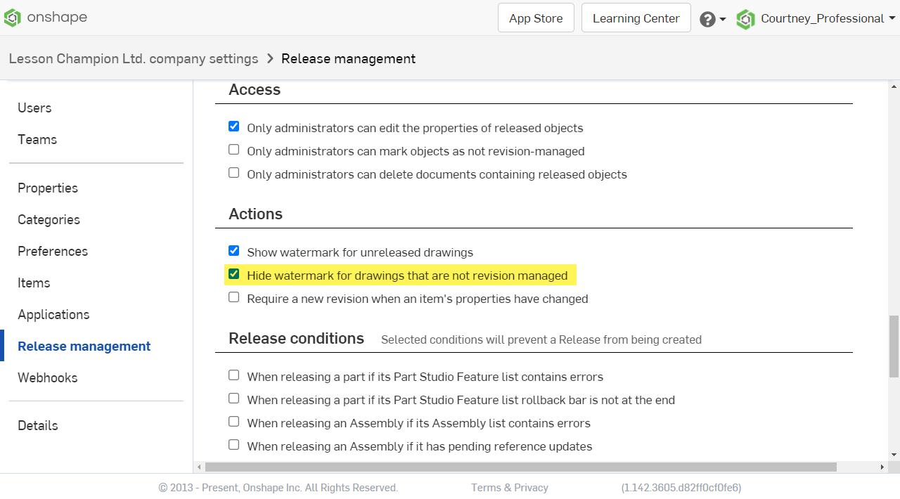 With either a Professional or Enterprise subscription, watermark options are found in the company/enterprise settings. These options are available for modification by company administrators. Once in the company settings, navigate to the Release Management section and scroll down to the Actions options.