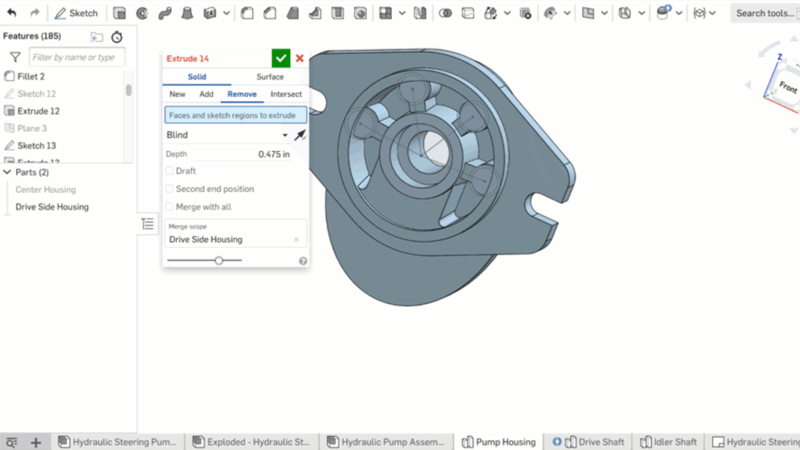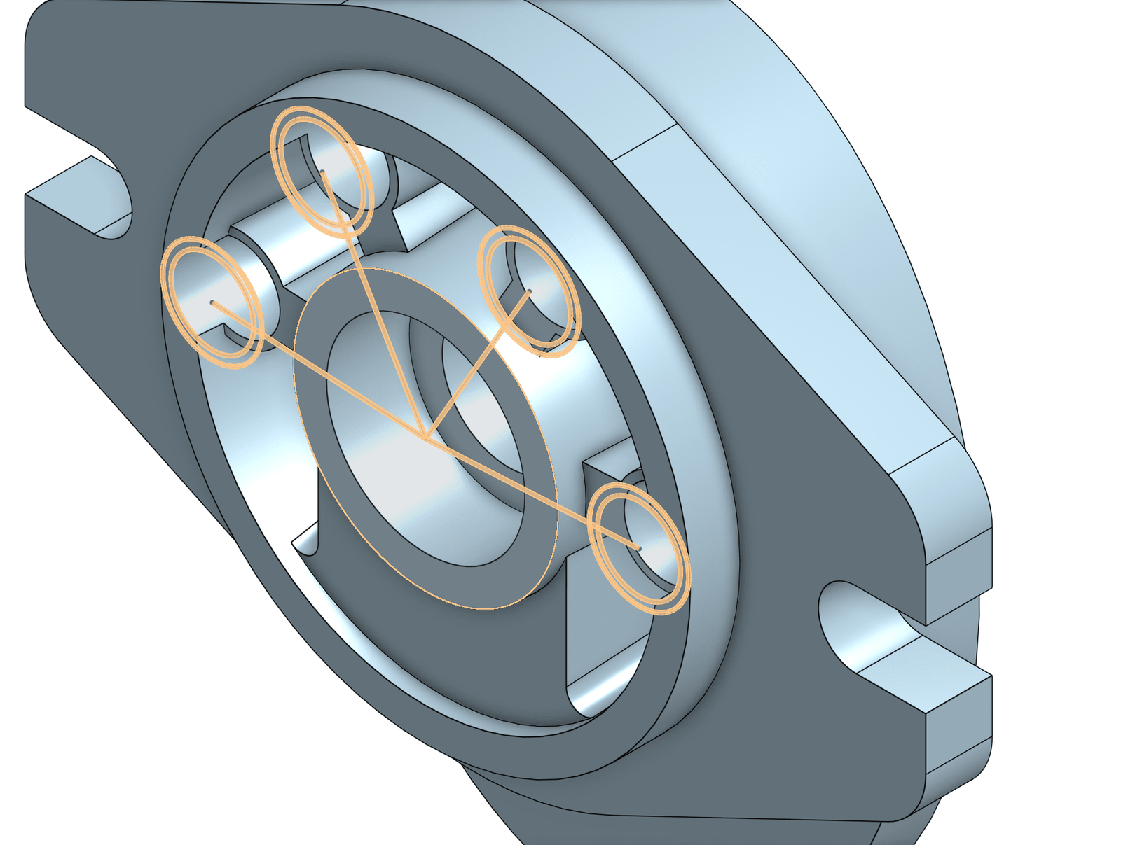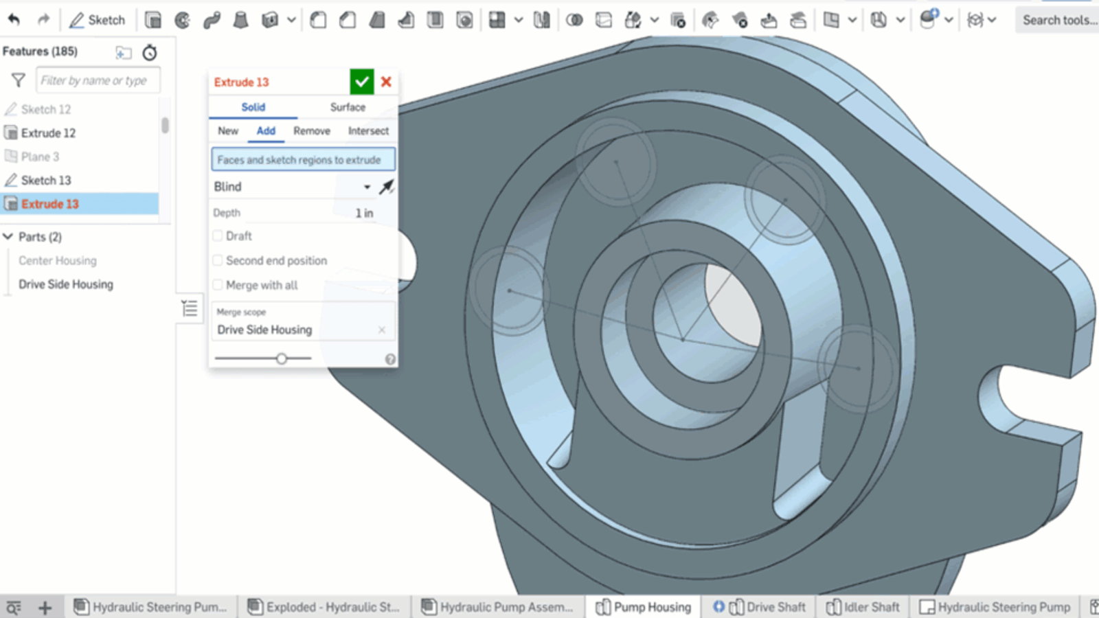In the hydraulic steering pump model below, there is a master sketch to define the bolt circle. The boss needs to be offset from the original sketch, while the hole will be extruded directly from the sketch. Without the ability to offset, you would need to separate them into two different sketches.