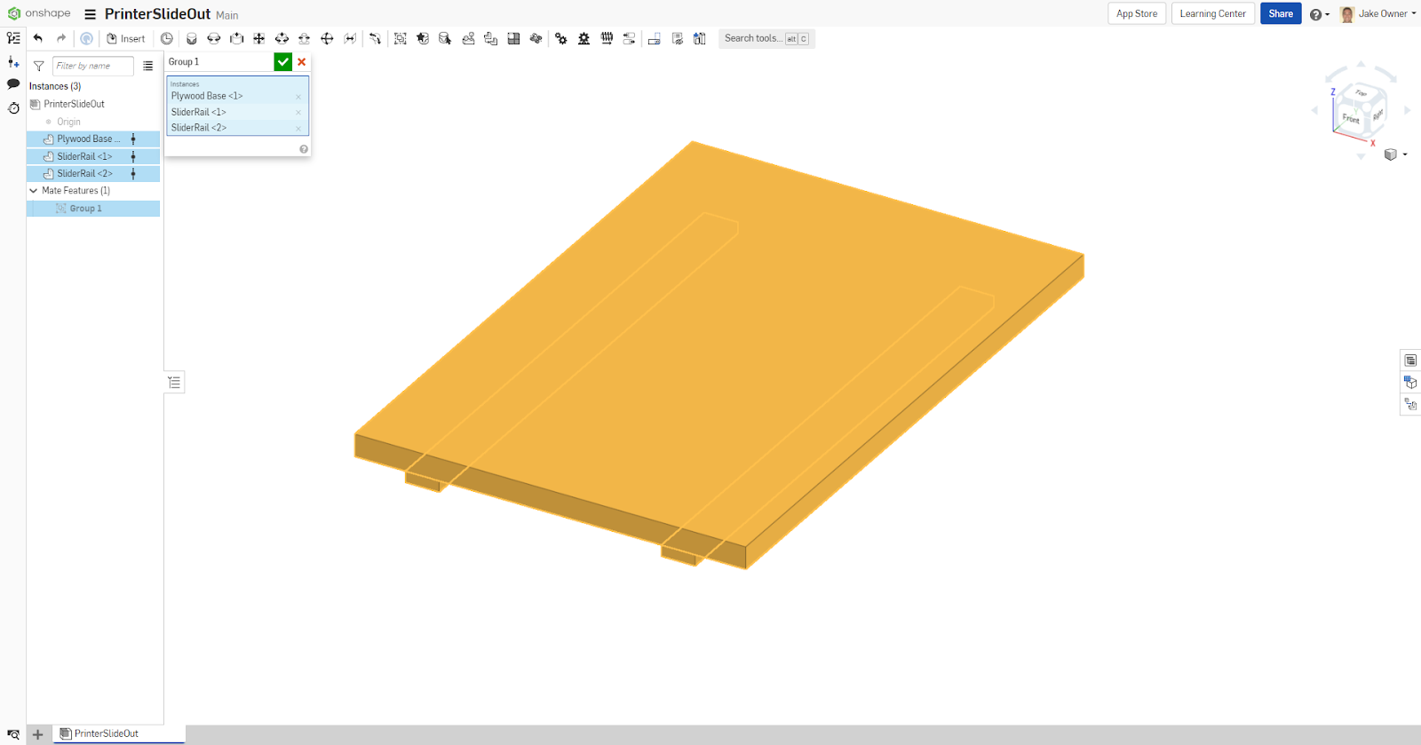 Another group is created for the printer slideout subassembly. This grouping will fully constrain that subassembly and will transfer when it is inserted into the top level assembly. Thanks to the Group command, the design has now been fully constrained after only two more mates are added, for a total of four mates.