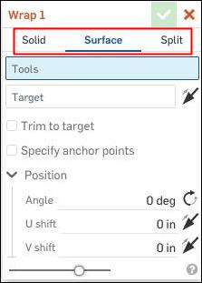 At the top of the dialog you can select Solid body, Surface body or Split face. Additional dialog options will appear depending on your selection type.