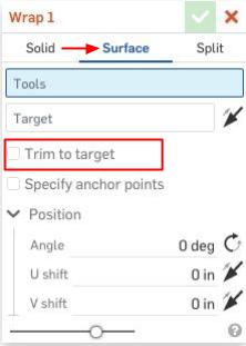 Similar to the Solid body, when the Surface body option is chosen, the Trim to target checkbox displays.