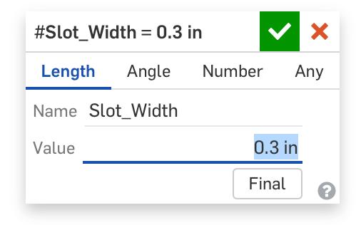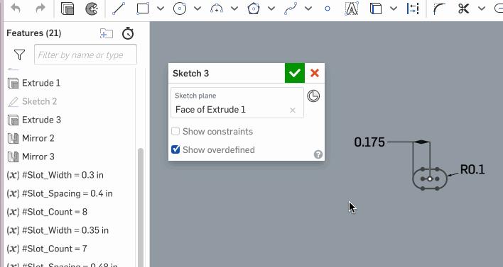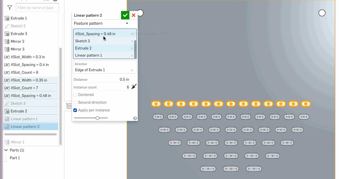The second pattern must include #Sloth_Width, #Slot_Count, #Slot_Spacing, slot sketch, extrude, and the original linear pattern. This is where all the variation occurs. Distance and instance count are not linked to any variables. Make sure “Apply per instance” is checked to recalculate the features for each instance. Otherwise, it will just pattern the existing geometry.