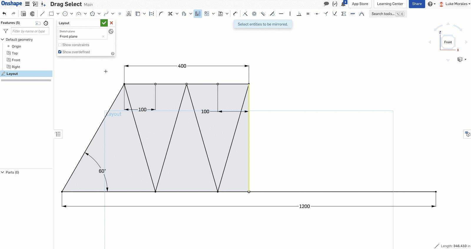 Let’s take the example of working in a sketch. In this example, I am creating the layout of a truss system. While creating the layout sketch, I want to mirror the layout I made from one side to the other. Of course, I could individually select each entity and take advantage of Onshape’s persistent selection. However, using Window Select in this case is more useful.