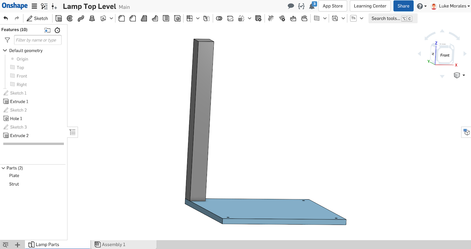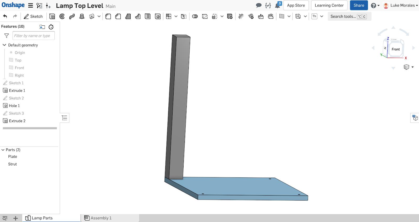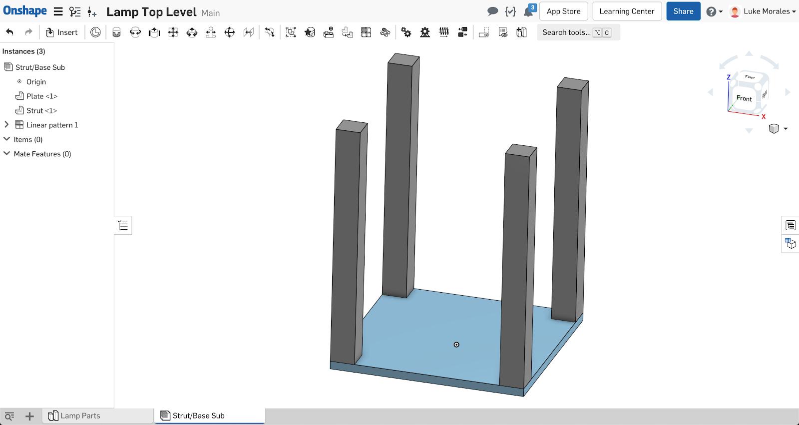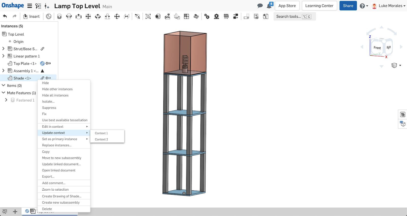 A design can proceed in this way. Creating tabs, instancing, and finally moving tabs out to new Documents. To complete this design, let’s say a light fixture was added to the lamp and then a top plate and shade were created in the context of this insert. Post context creation and assembly instancing, the Part Studio containing those parts was moved out to a new Document.