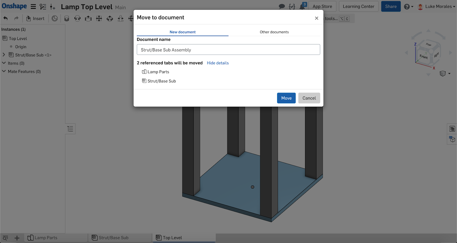 To do this, right-click on any tab that you wish to move out of the current Document. In this case, the assembly tab being moved references one Part Studio. Consequently, this Part Studio will be moved along with the assembly. I am choosing to move these items to a new Document, but the option also exists to move items to existing Documents.