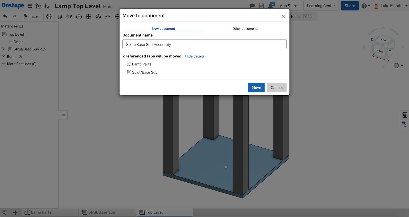 During the course of design, it is nice to follow a systematic way of organization and categorization. There are many ways to accomplish this within Onshape: Feature Folders, Tab Folders, Version and Revision control (to name a few). While an Onshape Document is a project-level container, creating multiple Documents for a single project is often encouraged to improve both performance and organization. This Tech Tip will focus on how to improve your project organization using the “Move to Document” functionality.