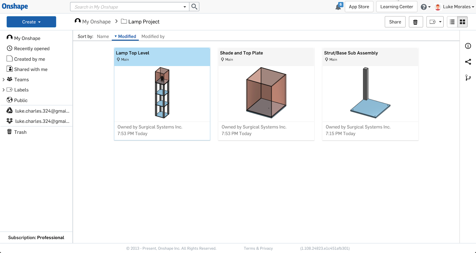 Let's say we were beginning the process of a design project. The first step would be to create a project-level folder— in this case “Lamp Project” — and then a Document that will ultimately hold the top-level assembly within the folder. As the design starts, the initial state of the Document looks like this: