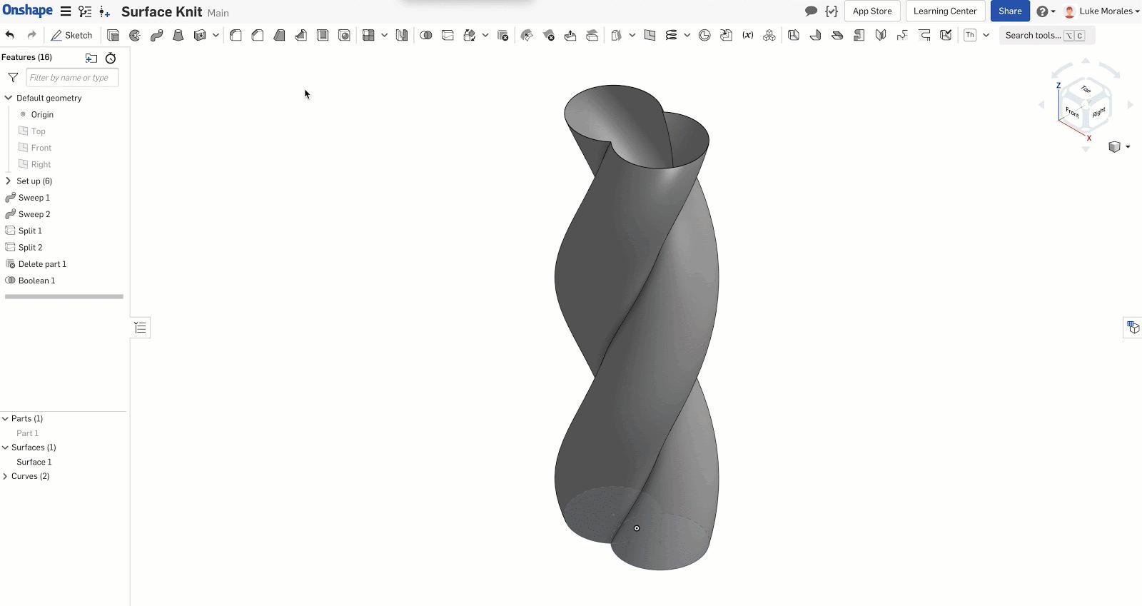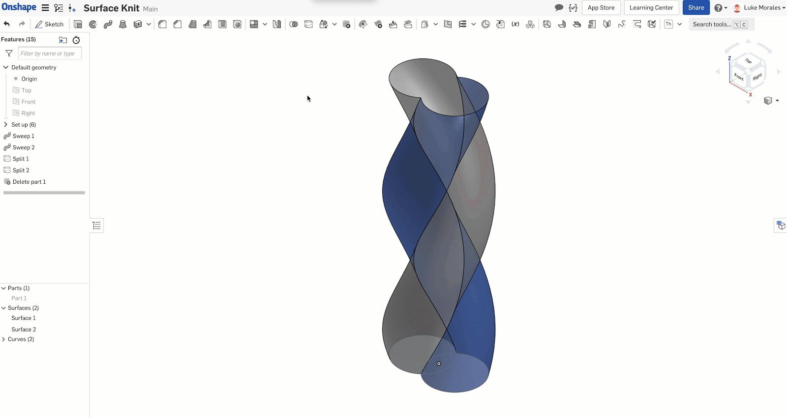 Of course, there is an overlap based on the sketch. In this case, I would like to delete the overlap between these helices and knit the remaining surfaces together. To accomplish this in Onshape, this sequence of tools is employed: