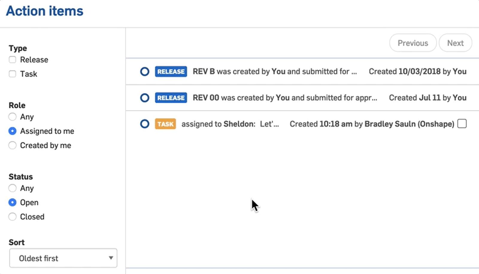 The Action Items view gives you a look at all of your outstanding actions to take within Onshape for both release candidates and tasks. You can learn more about action items from our previous tech tip on assigning tasks.