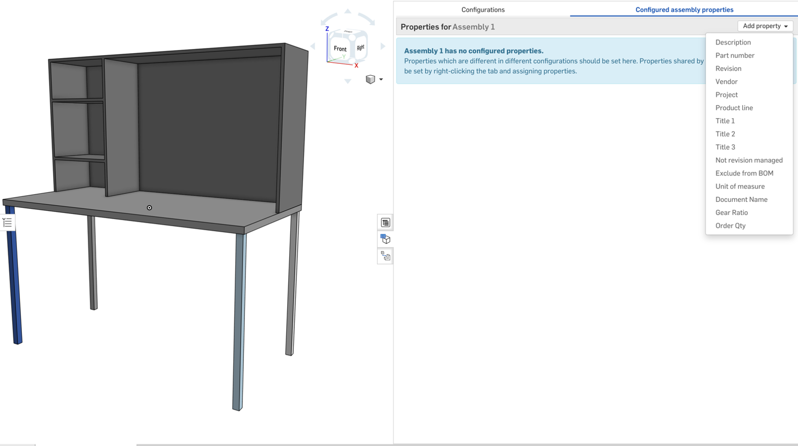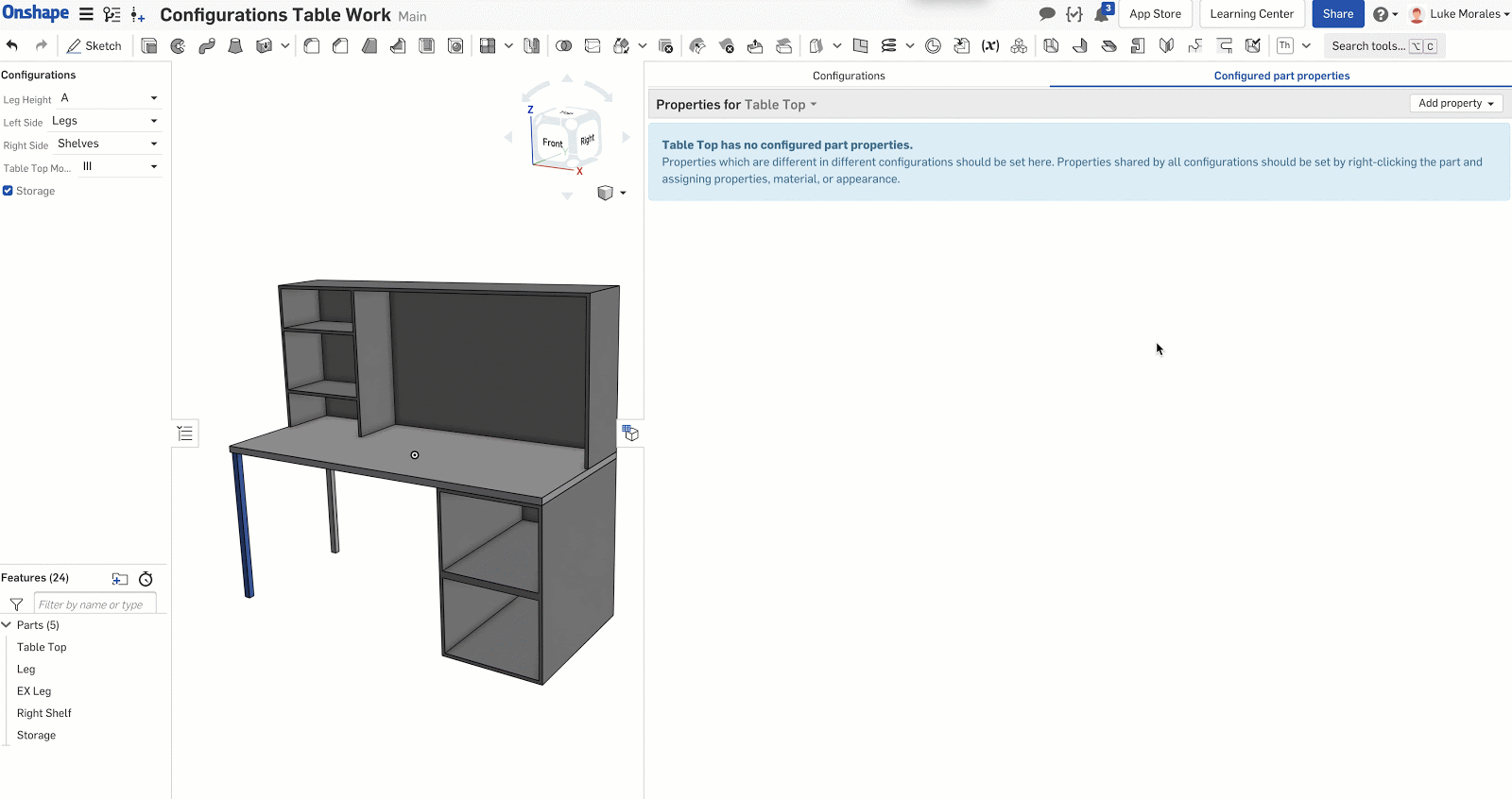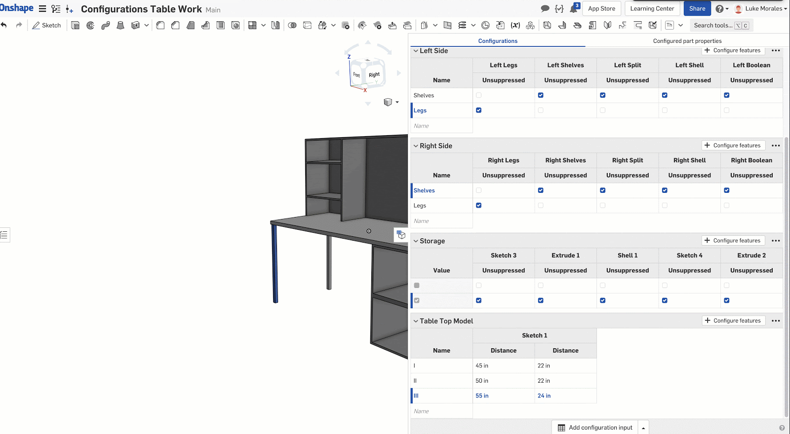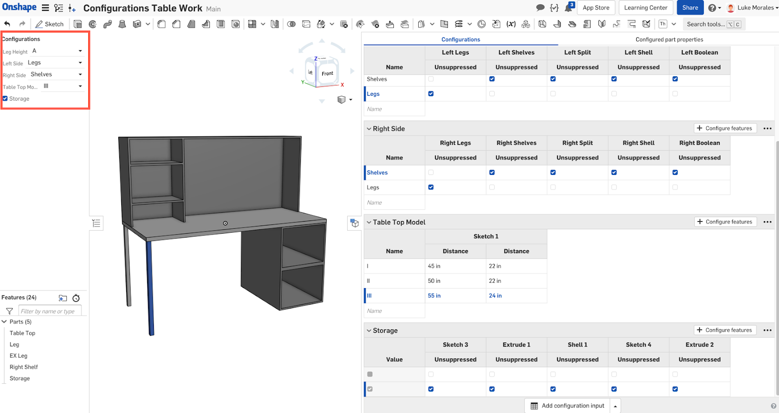 In this example, I have a desk design that has 5 different configurations to choose from for assembling the final part.