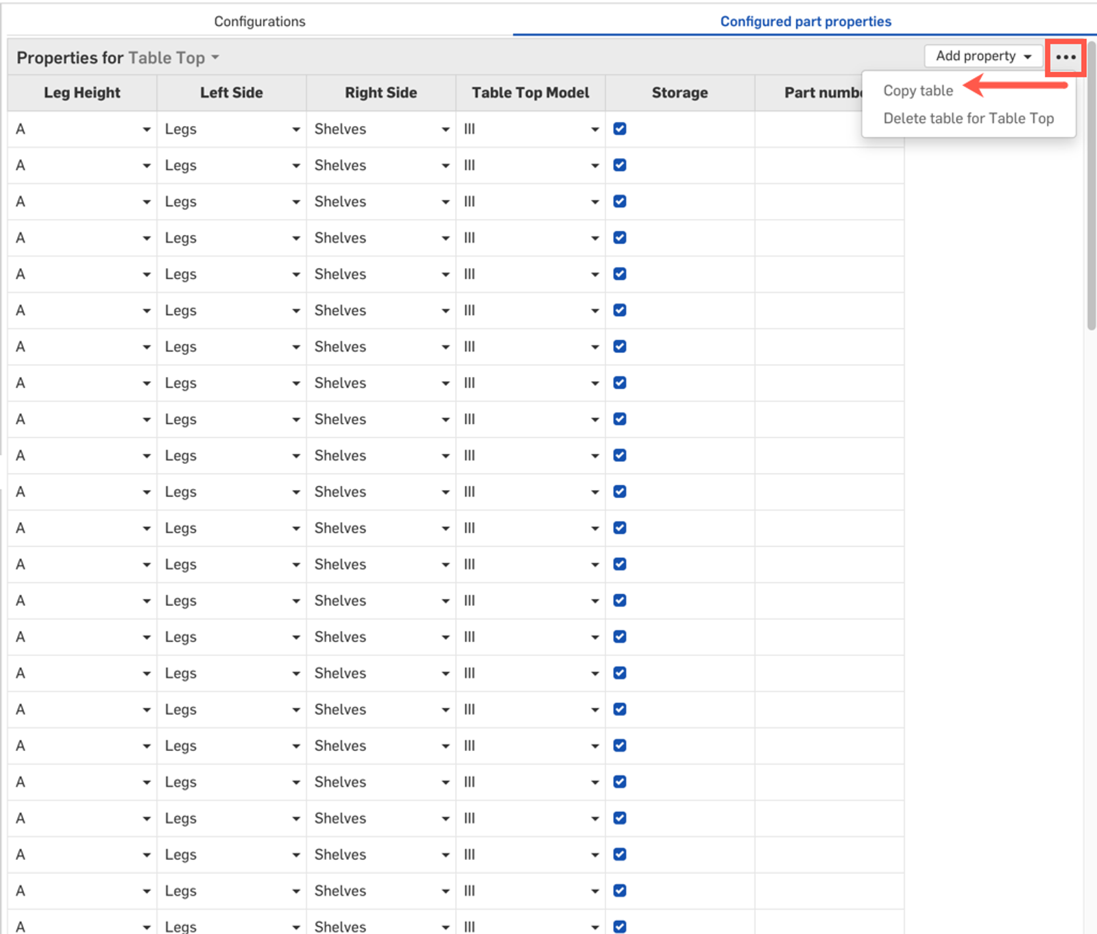 For example, let’s say we wanted to ensure that the table top part had the correct Part Number for each configuration. In the following video, I opt to add Part Number as the part property to configure.