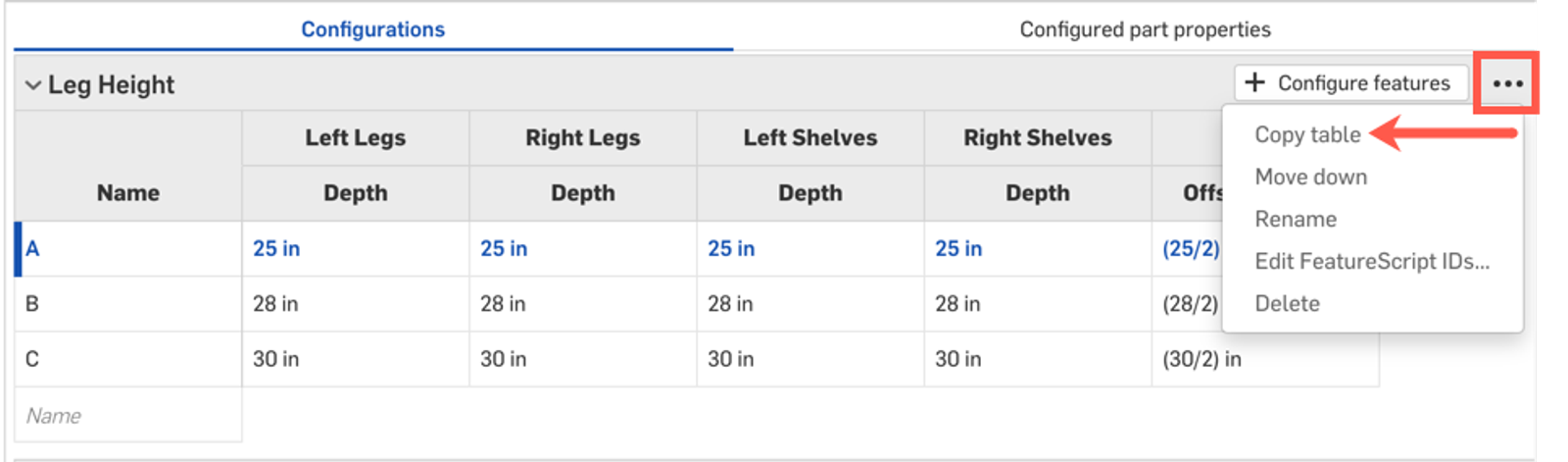 To construct these tables, you can create them natively within Onshape. However, if you want to do things that require cell dependency or perhaps use advanced equations or optimization solvers, you may opt to design your tables in a separate spreadsheet. To get the correct formatting, copy the table using the Copy table option from the 3-dot menu.