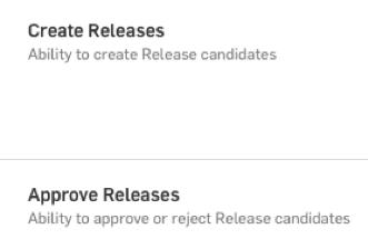 What about assigning roles when using Release Management? With Admin permissions, a user can create and approve any and all release candidates. A user assigned the Member role would need to specifically be given create/approval permissions (see options below).