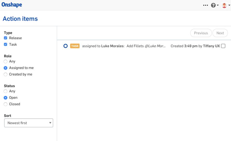 Note that you don’t have to be within an Onshape Document to view a full list of your Action Items. From the account dropdown menu on the top right-hand corner of the interface, you can also access your Action Items.
