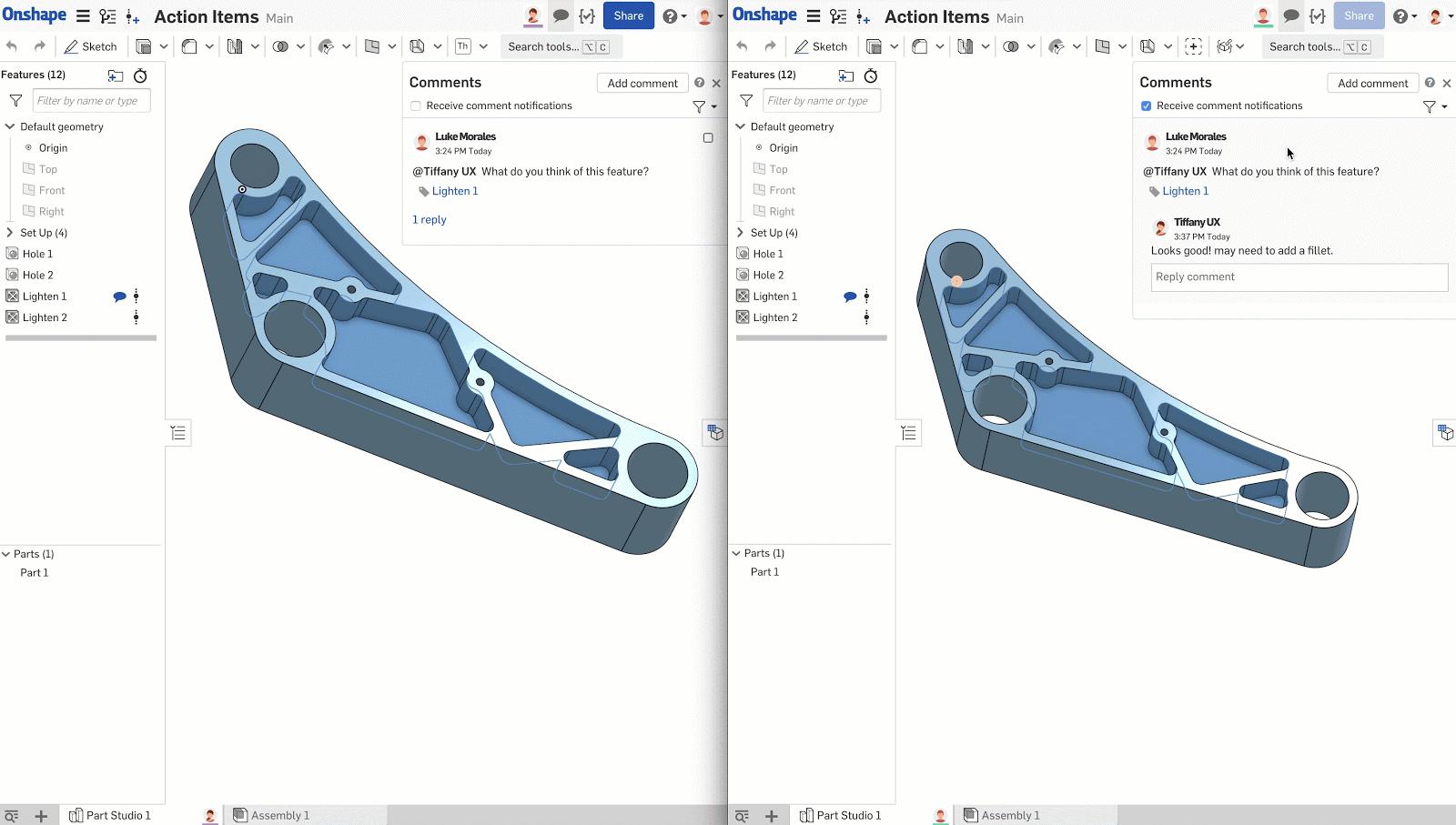 During the course of the design and iterative process, it is common to split up tasks between various team members to get the job done. Onshape’s Comment functionality is perfect for discussing changes and even tagging entities to eliminate ambiguity.