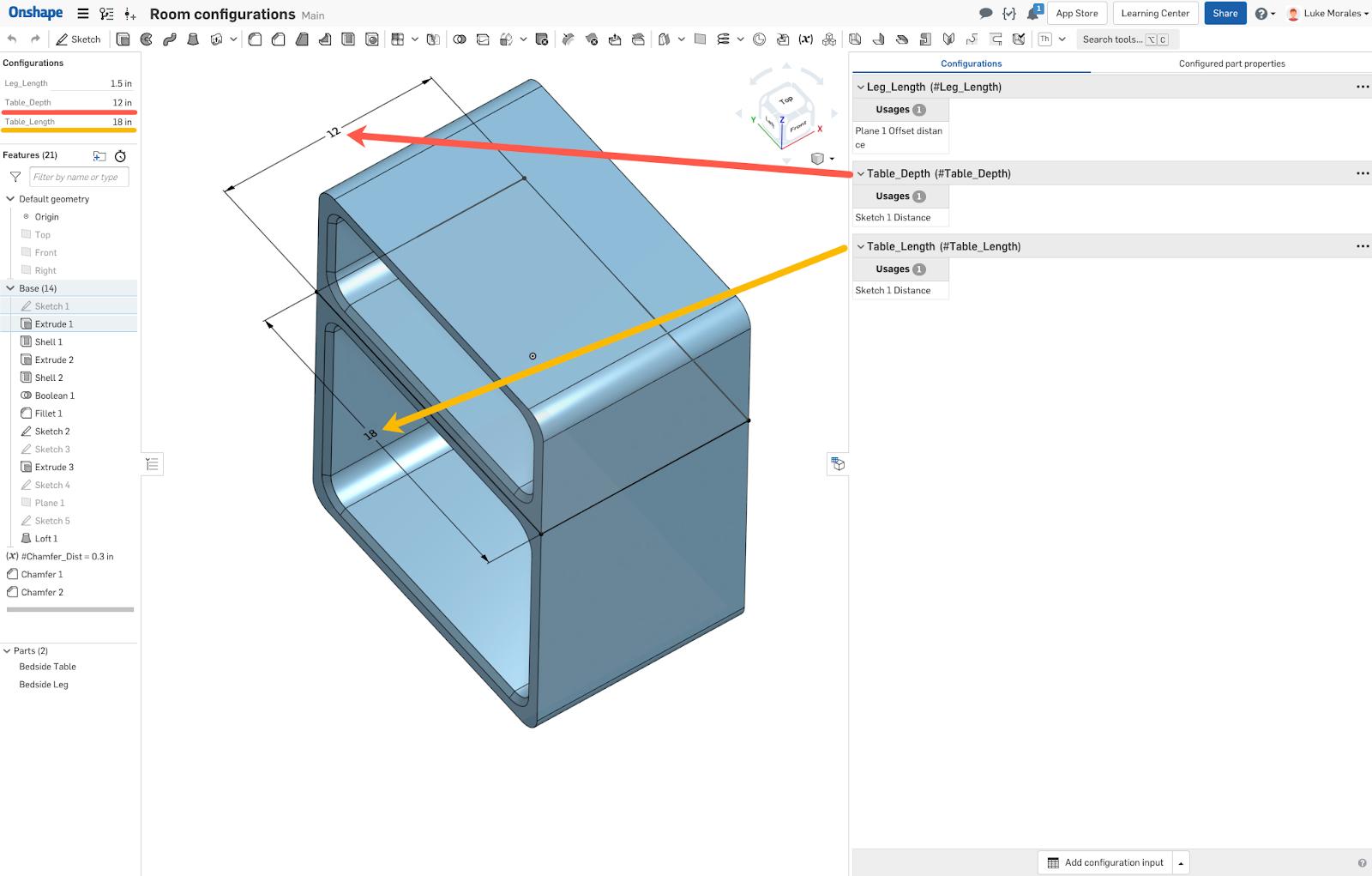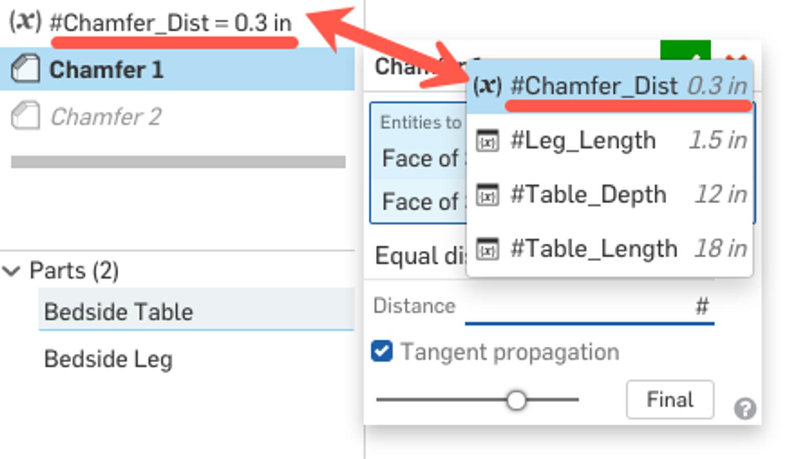 3. Many dialogues in Onshape can take in formulas. In these dialogues, any variable can be used in a formula. This is useful when you want your design to have self relationships or even spatial relationships. For example, in this Bedside Table Part Studio, I can set ‘Chamfer 2’ to the equation