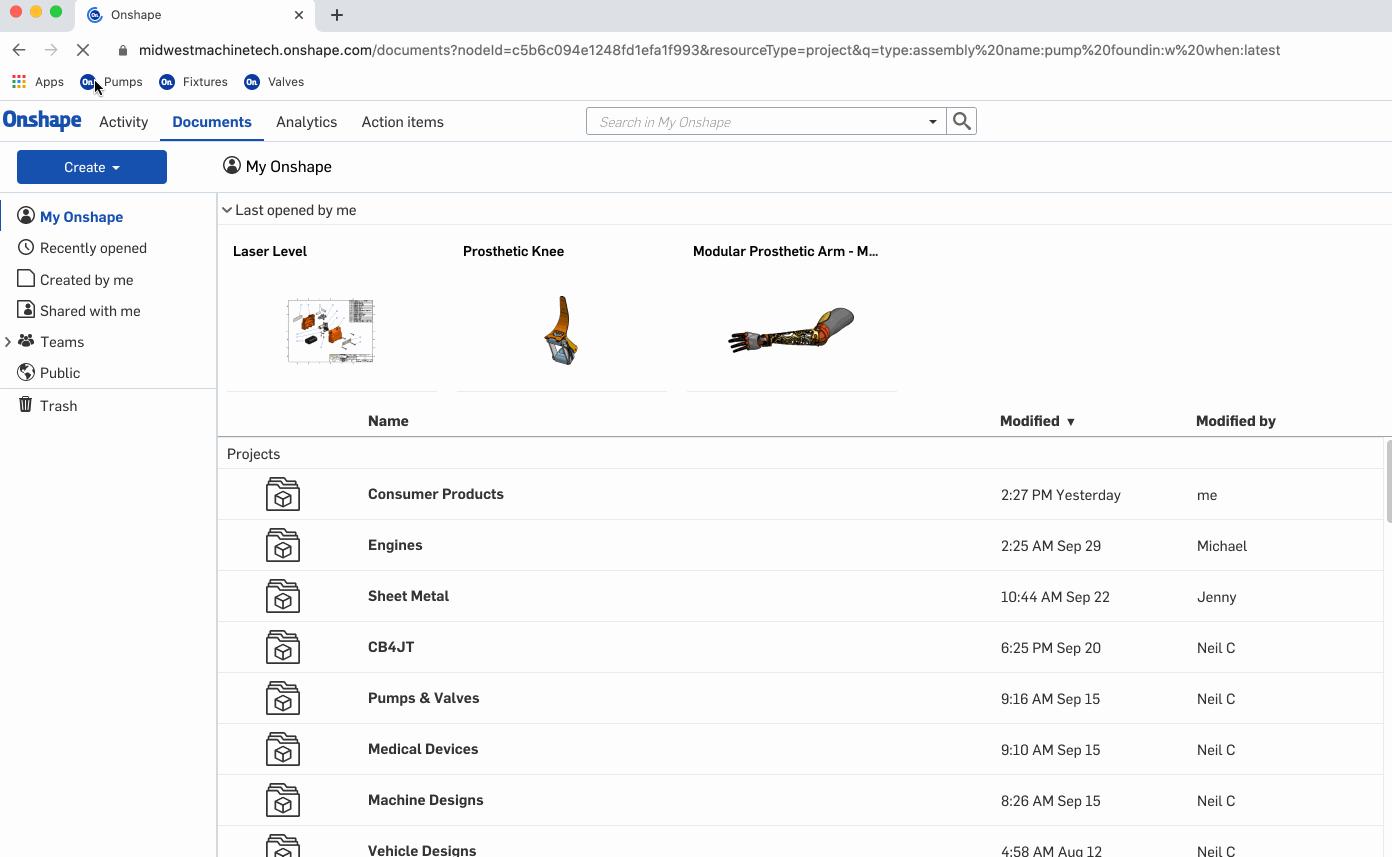 When you do a search in Onshape, the criteria for the search is put into the address string. For example, the image below is searching for assemblies with “pump” in the name. The type and name are explicitly called out in the address bar once the search is complete.