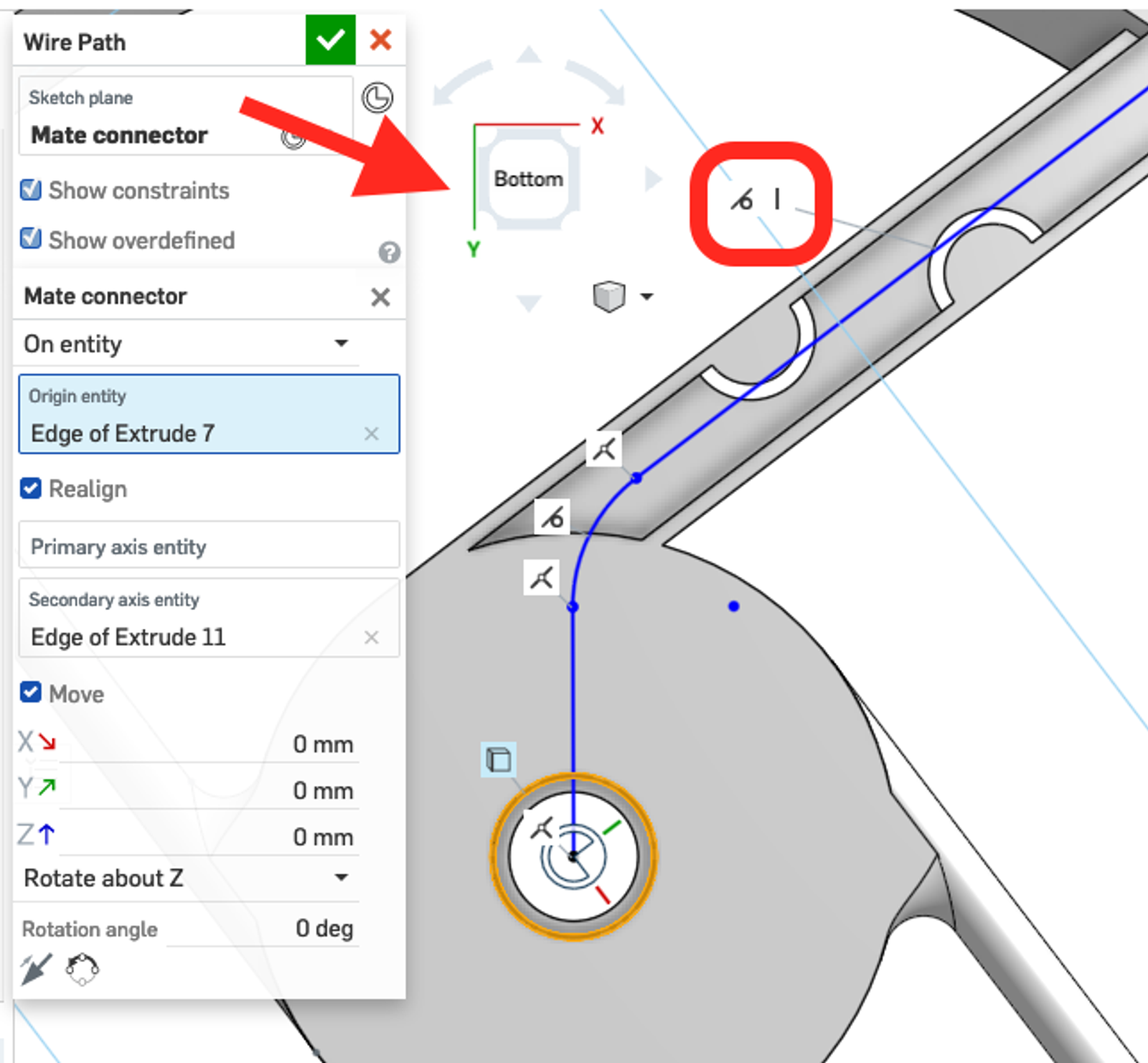 By clicking on the Mate Connector icon in the ‘Sketch plane’ selection dialog, a new dialog opens up to modify the Mate Connector that was created. From here, realigning and repositioning the Mate Connector will cause the sketch to reach accordingly, including its constraints as seen in the example below.