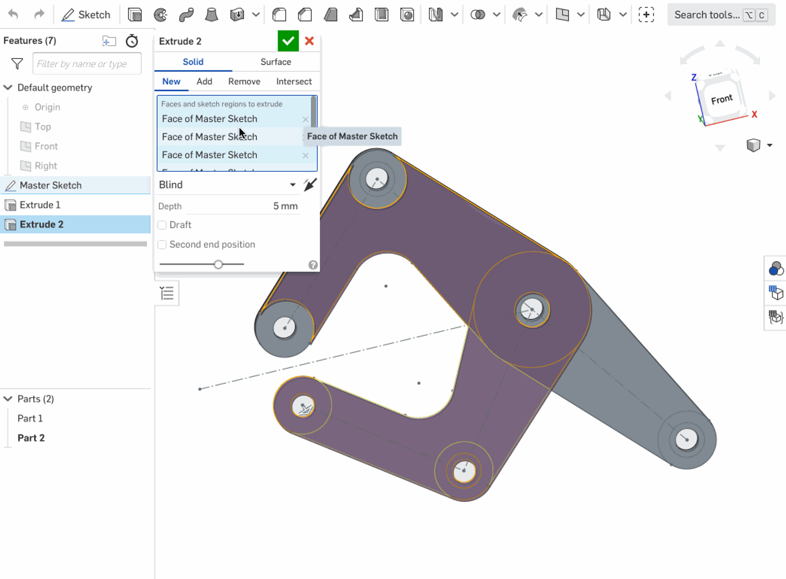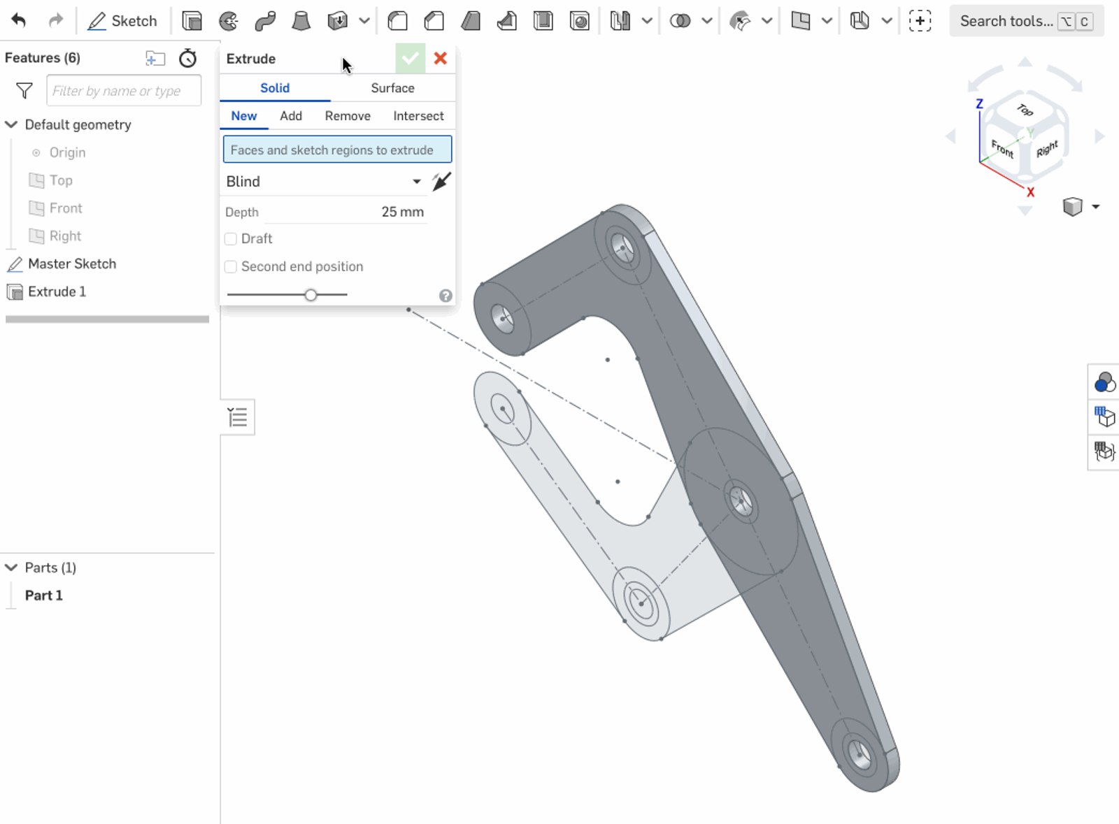To repeat a feature, hold down “Shift” when pressing “Enter” when finishing the feature. It’s especially useful for Part Studios like the clamp because it involves many extrudes from a master sketch.