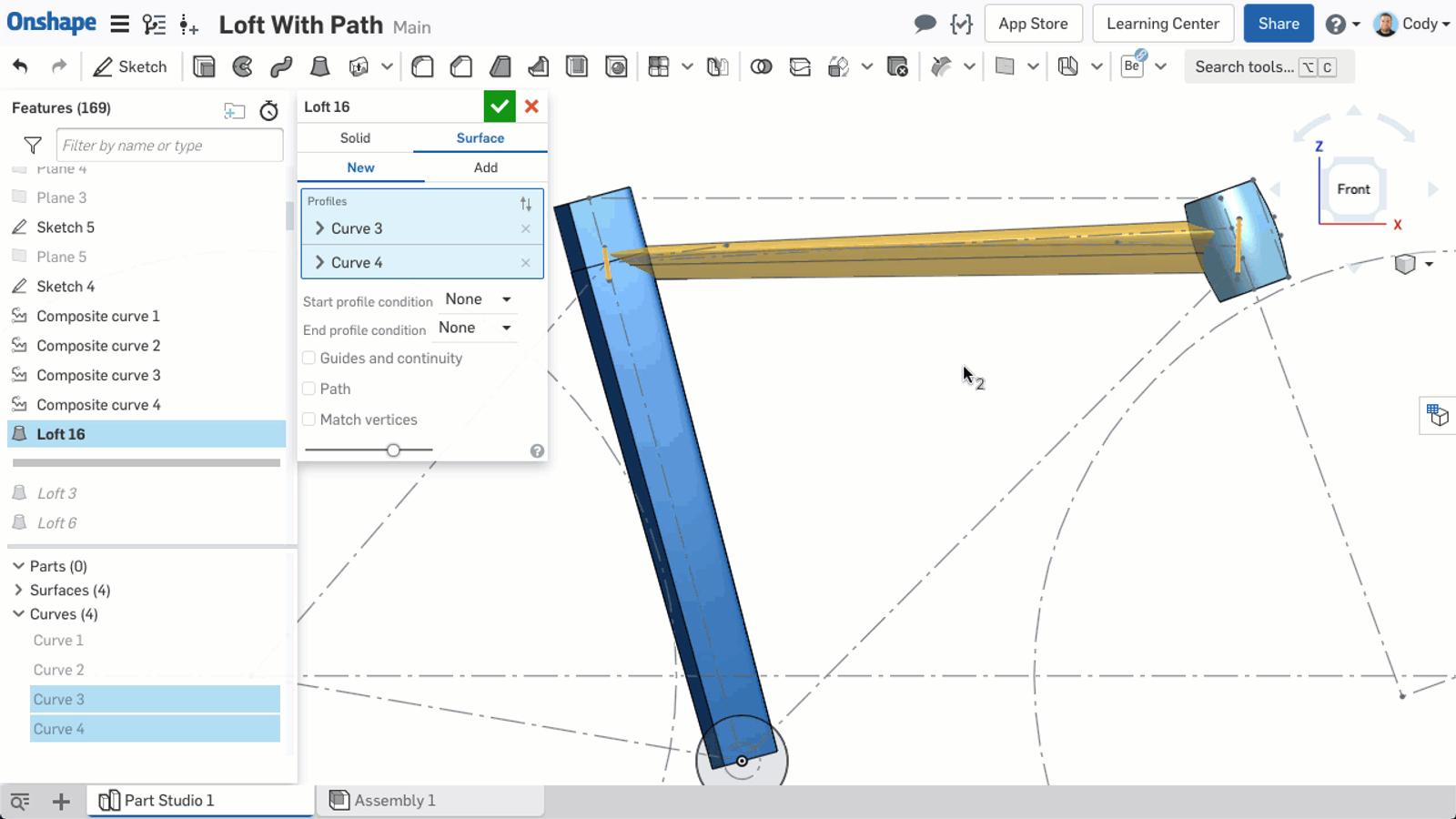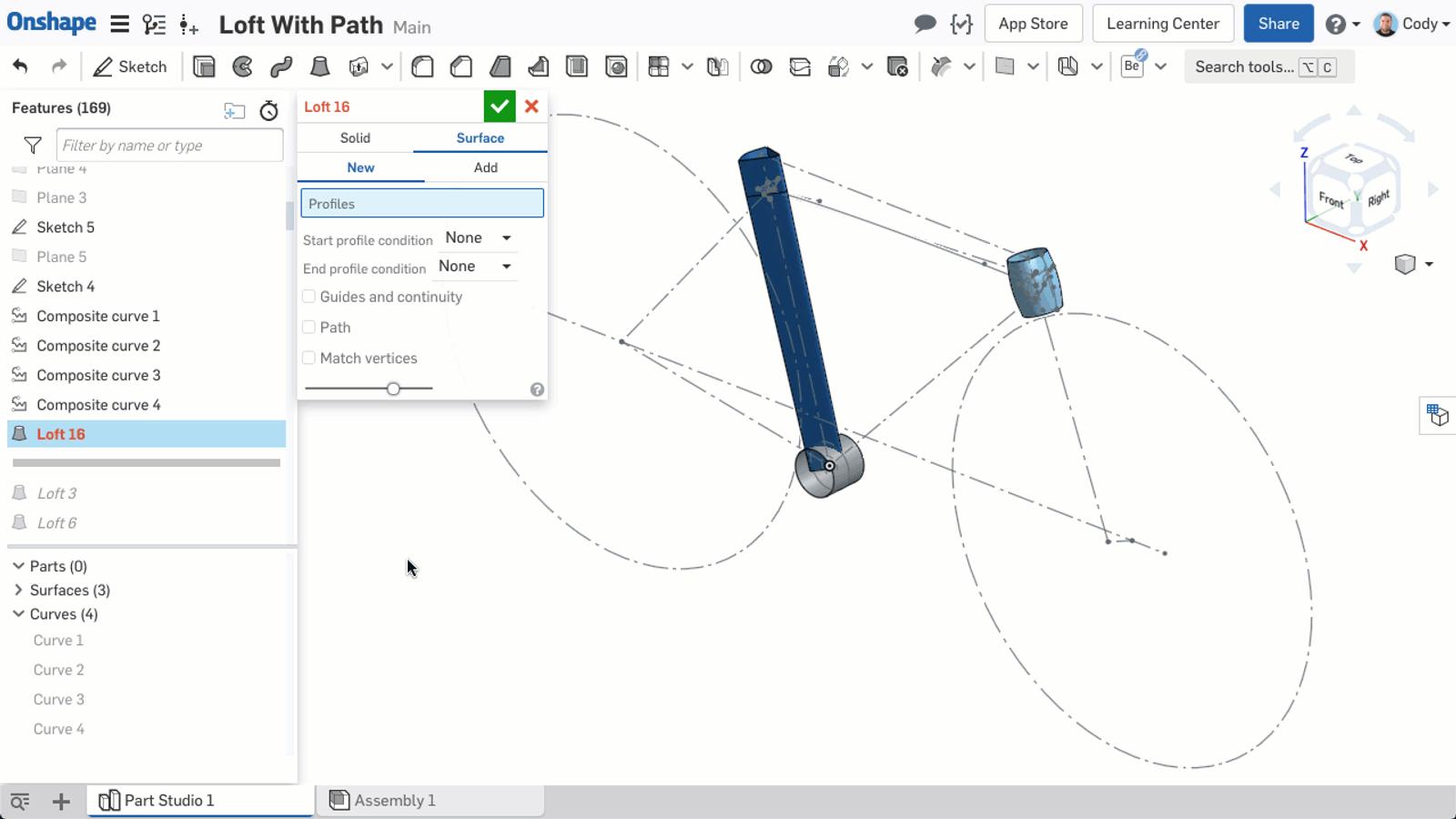 The Loft feature in Onshape is a powerful tool that allows you to create many different shapes. It has options that let you match vertices between your selections, control the loft with Guides and Start/End Conditions, and much more. Let’s take a look at one of the more useful Loft feature options: the ability to control a loft with a path.