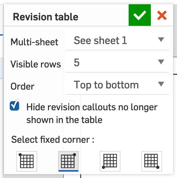 Select the icon that matches the corner of the table to set as your fixed corner. By default, Onshape will have the revision table fixed to the top-right corner.