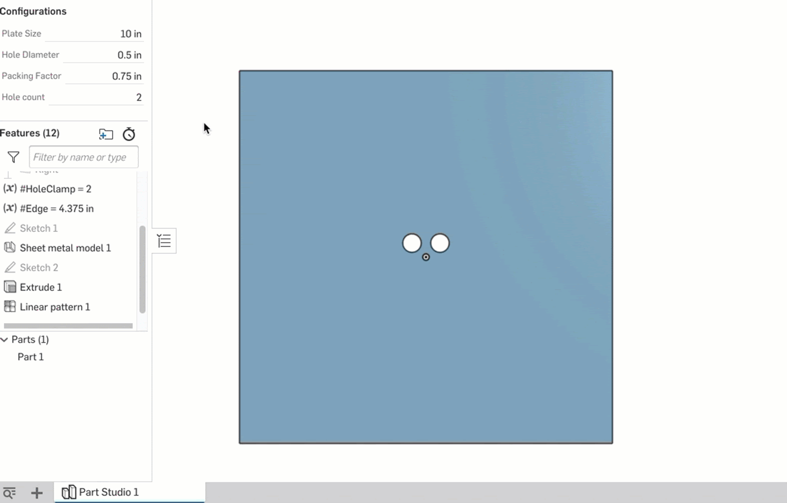 I have a combination of configuration variables and parametric variables in this Part Studio. The configuration variables will control the plate size (#Size), hole diameter (#Hole_Diameter), distance between holes (#Packing_Factor), and number of holes per row (#Hole_count).