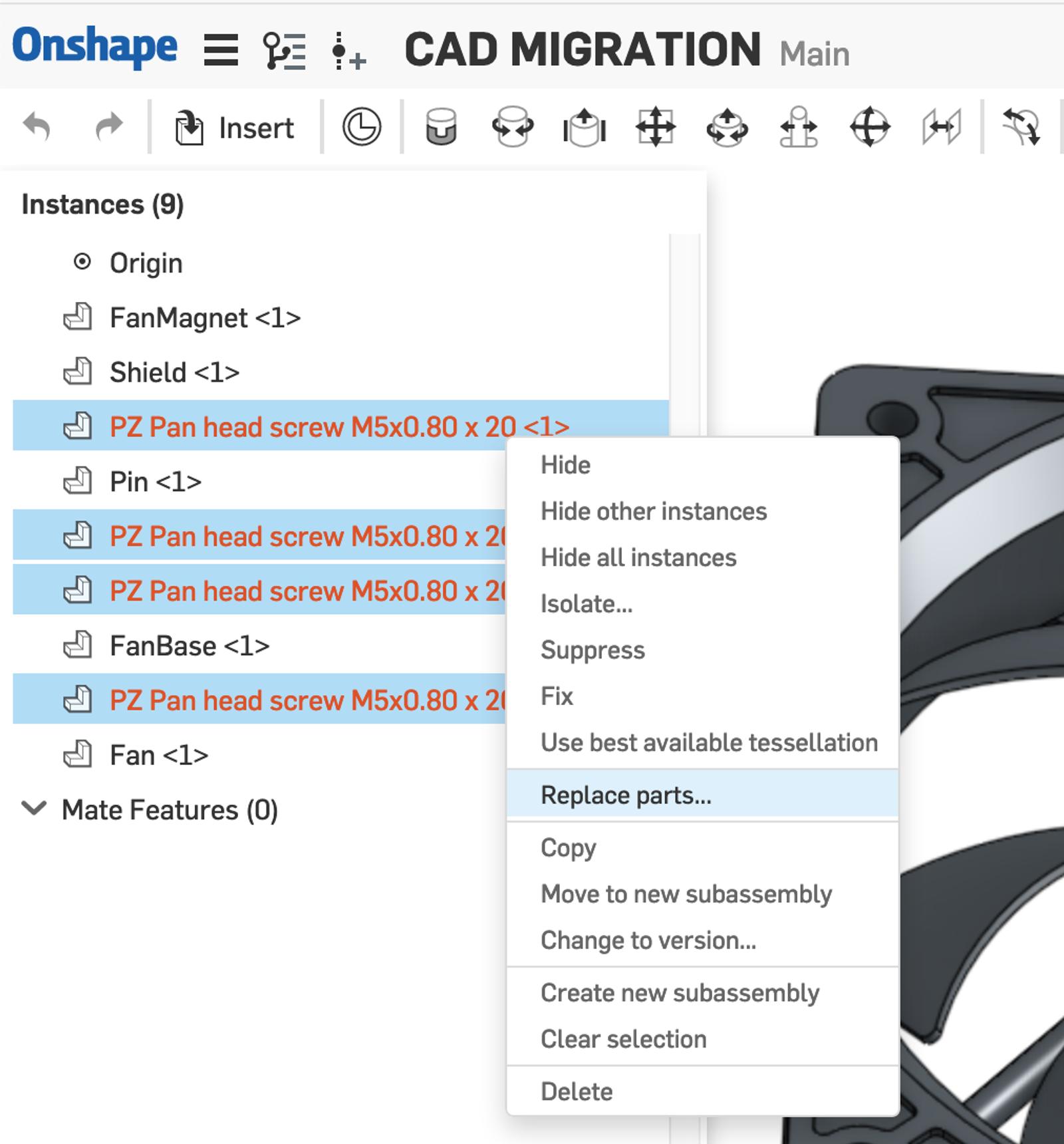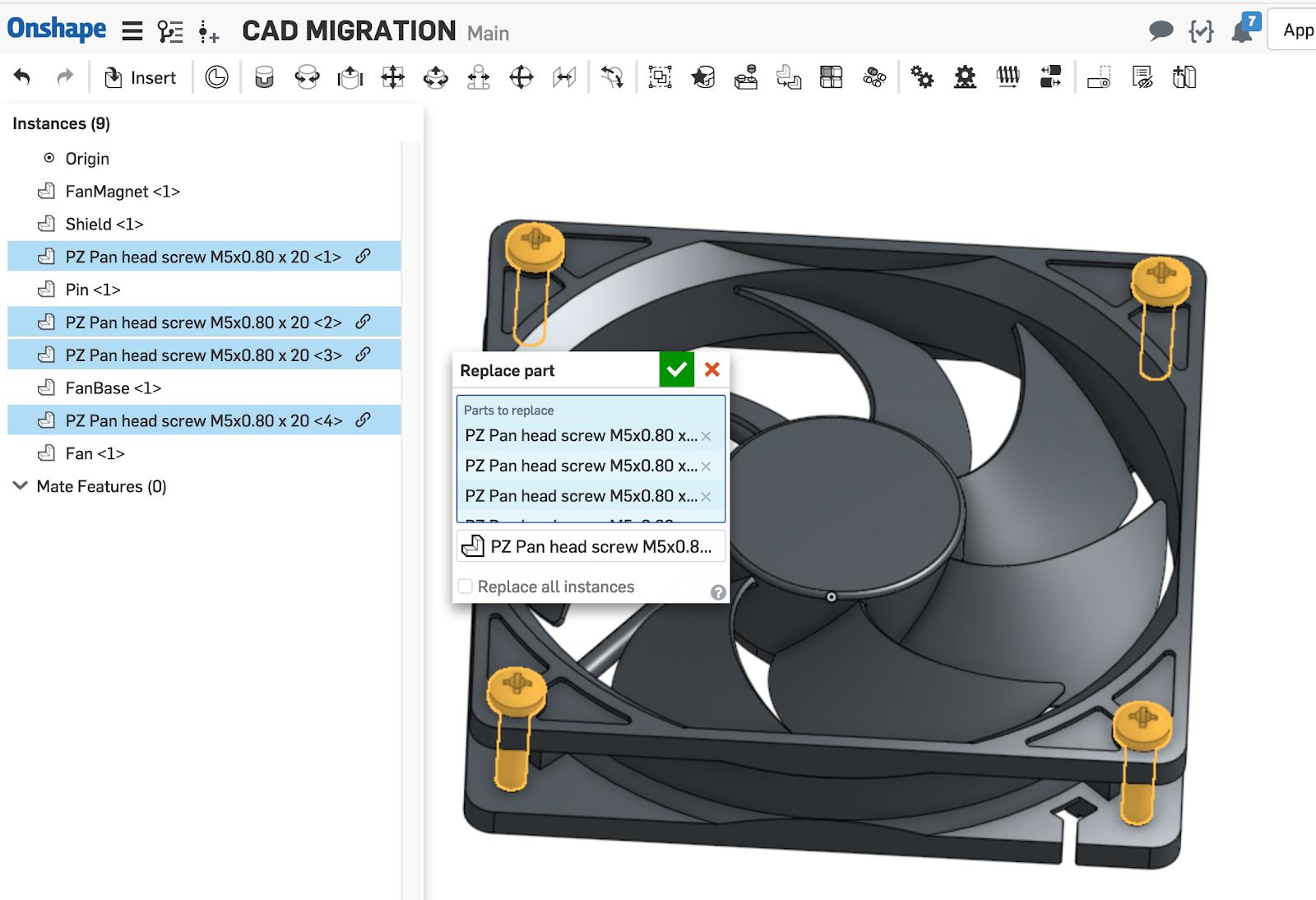 Migrating CAD data can be cumbersome, especially when you end up with multiple copies of the same common components from your projects. Onshape’s database-driven architecture along with the use of Replace Part provides an efficient method to reference common components to a single database instance for better part management.