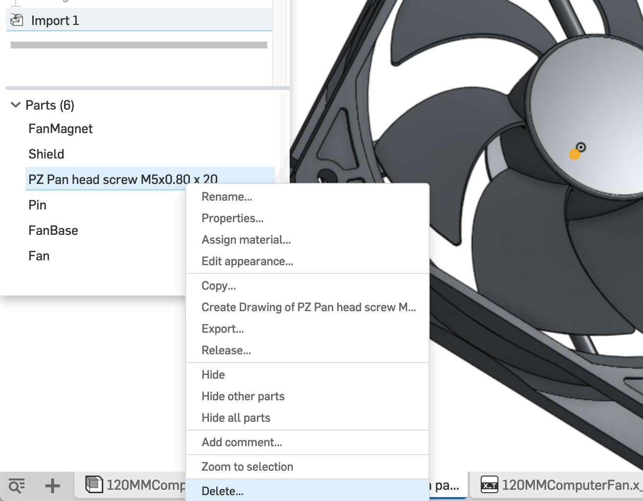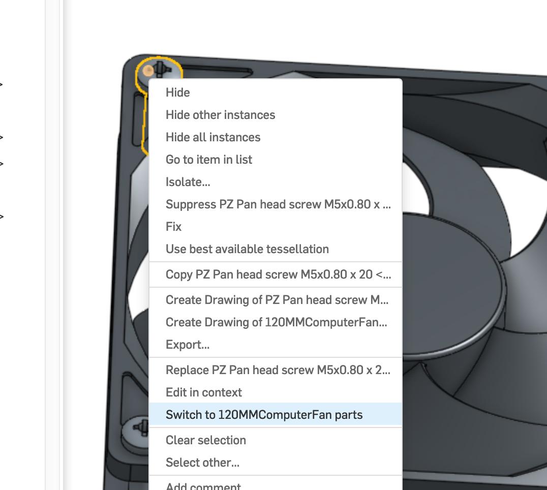 While the data is importing, let’s return to the top-level assembly, right-click on the part and use “Switch to … parts” to follow the part down to the source Part Studio.
