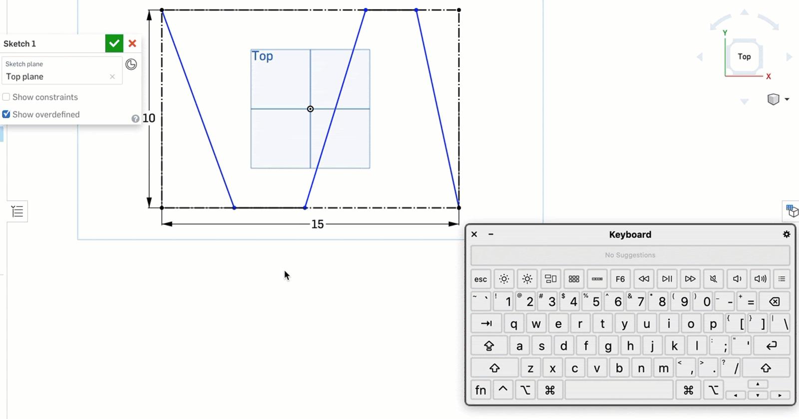 This shows a case in which multiple entities intersect at the same point in this sketch plane. Once hovering over the point of interest, use the ~/` key to select other entities. The keyboard viewer shows the workflow of first using the ~/` key, followed by the up-and-down arrows to navigate the resulting dialog box. Select “enter/return” to complete the selection of the sketch entity that is bolded.