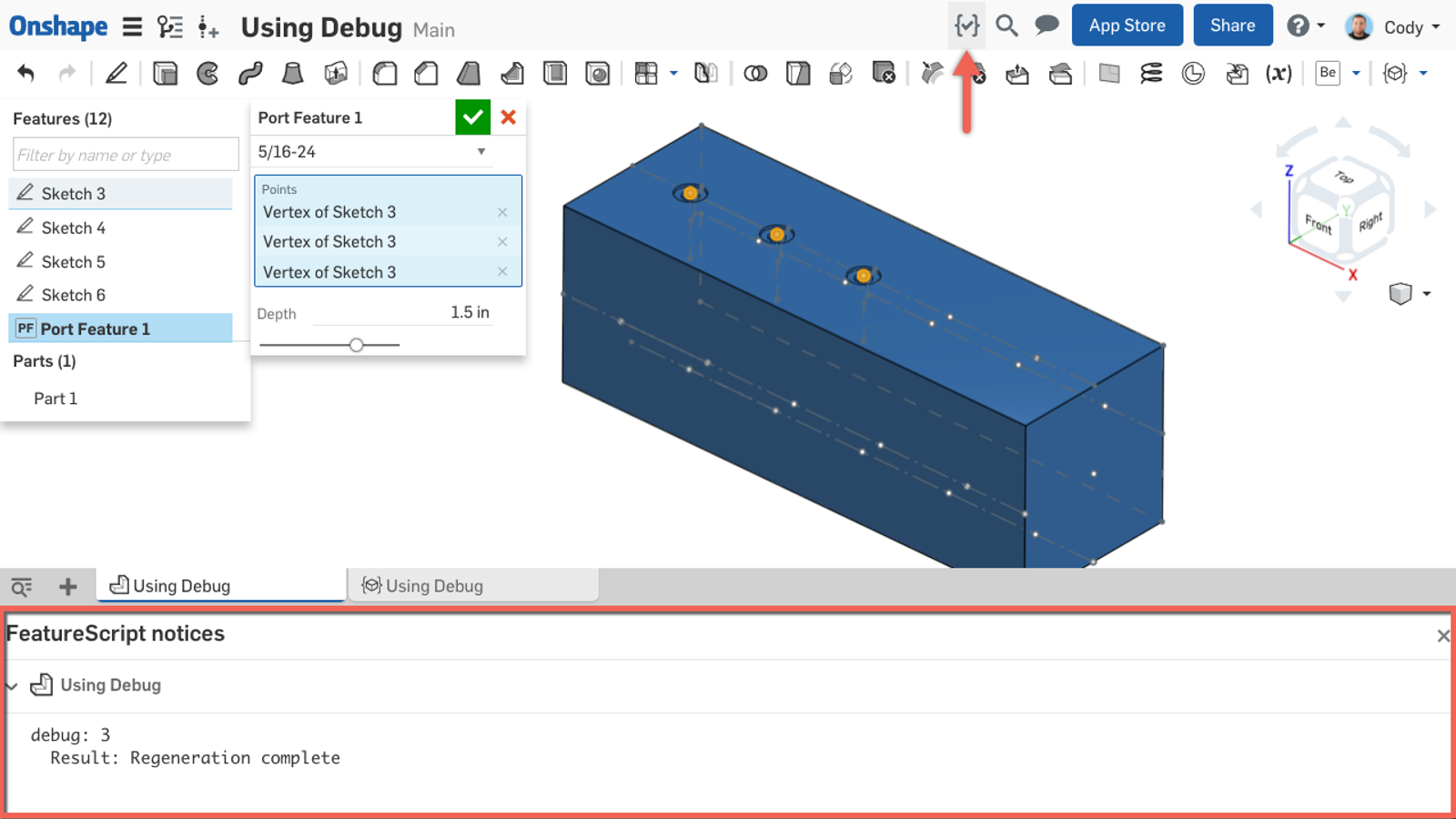 So how do you see the result of using debug? Use your custom feature and click the FeatureScript notices icon in the top right corner.