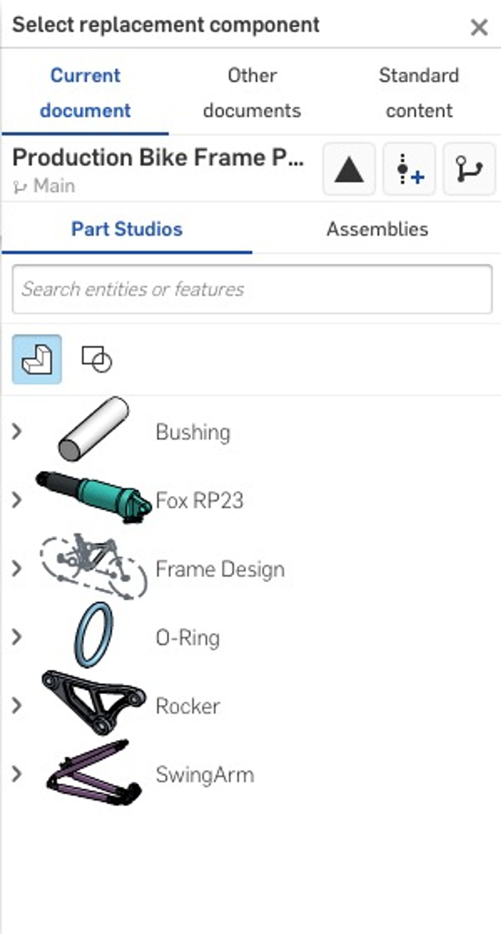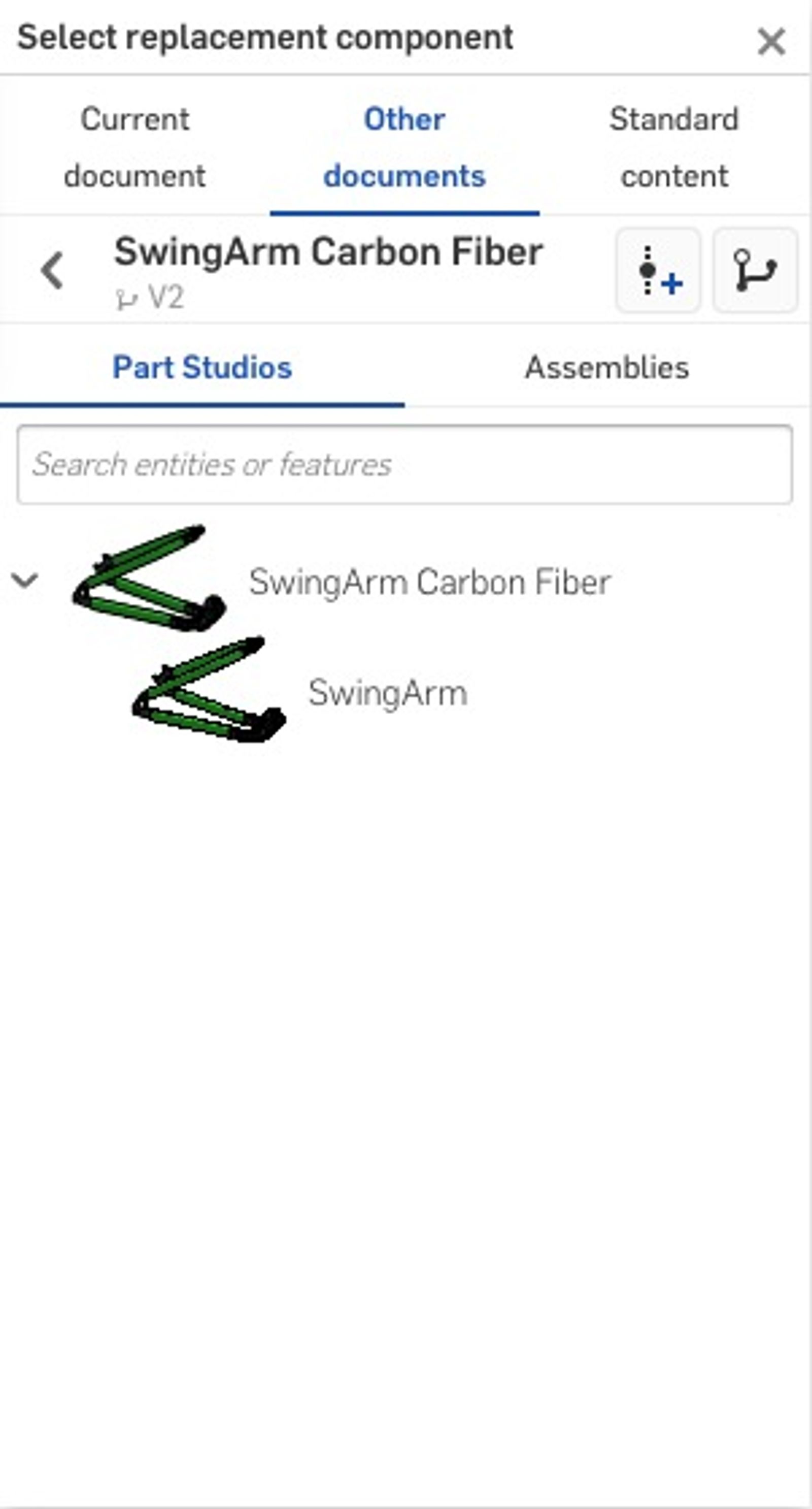 Next, select inside the Select Replacement Component field to access the Select Replacement Component dialog. Within the dialog, you have the ability to use the search toolbar, Part Studio and Assembly filters, revisions, versions or branch workspaces to browse for replacement components within the current Document or other Documents.