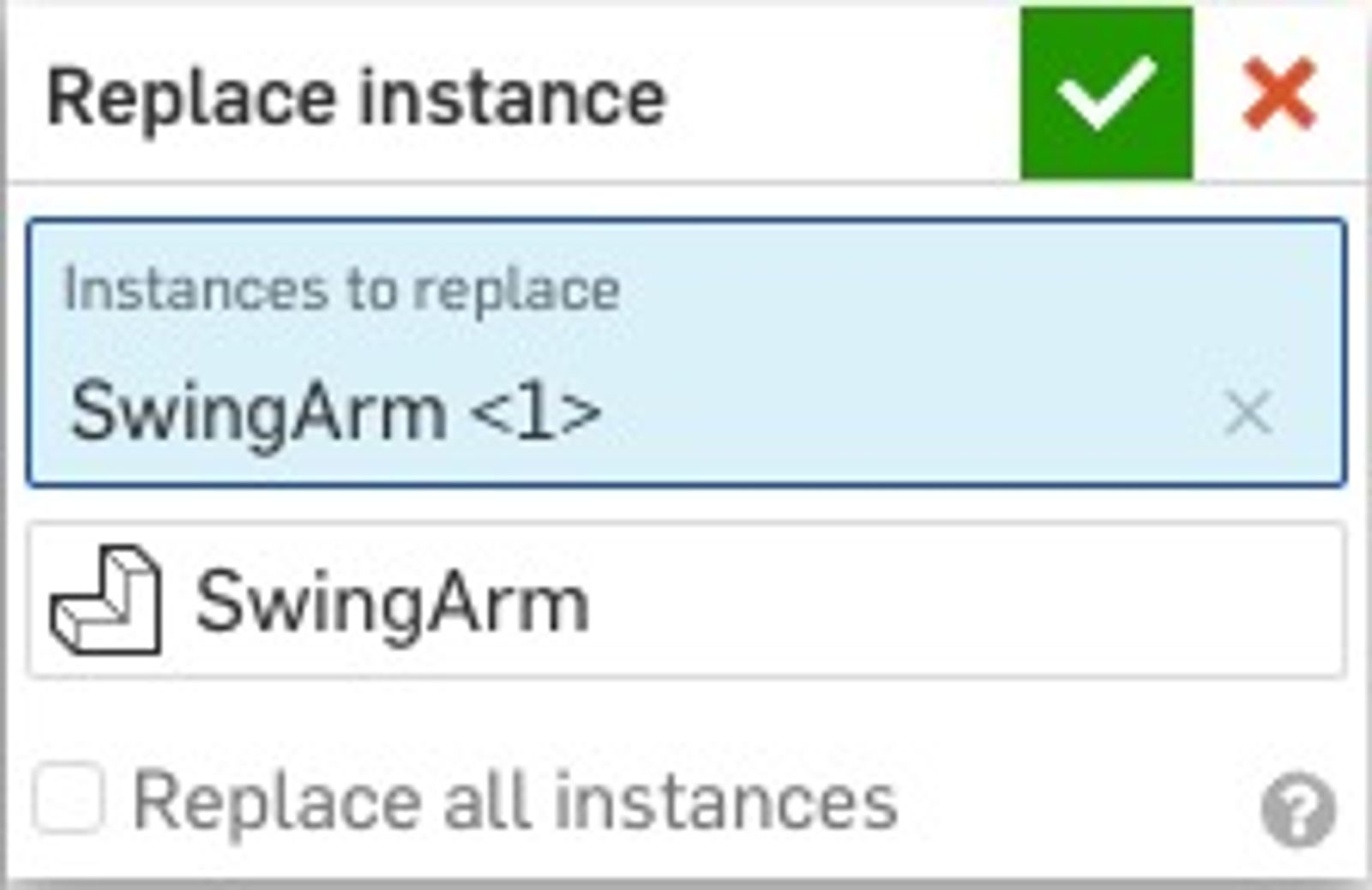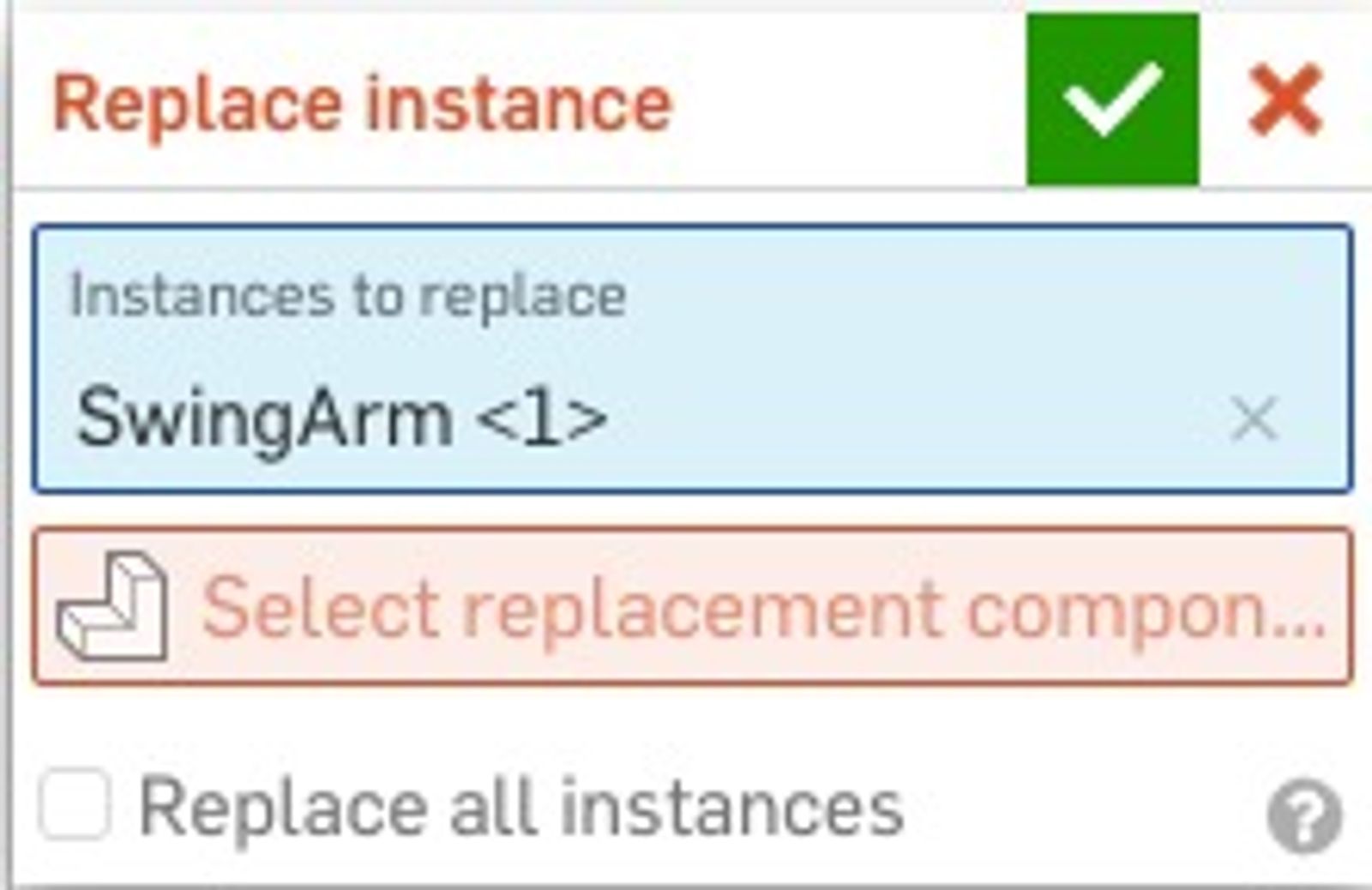 To accept the changes and exit the dialog, select the green check mark. To cancel the changes and exit the dialog select the red X button. The replacement component will display within the instance list and graphics area.