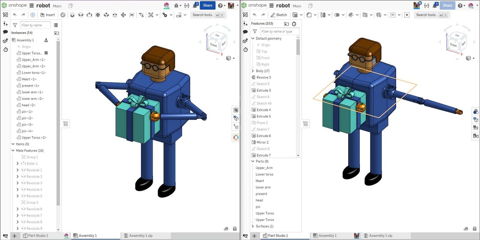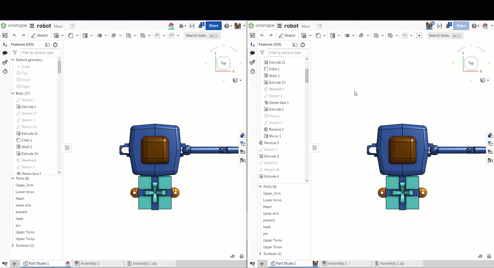 On the left, I am signed in as Jenny and I have the assembly tab open. On the right, I am signed in as Stella and she has the Part Studio 1 tab open. We have a few ways to know that we are both currently in this document – they are called Social Cues.