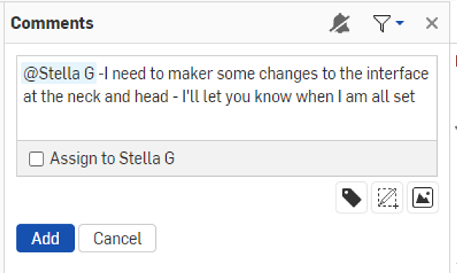I can open the comment panel on the side to send comments to other users. I can include screenshots, tag entities or attach other documents to the comment.