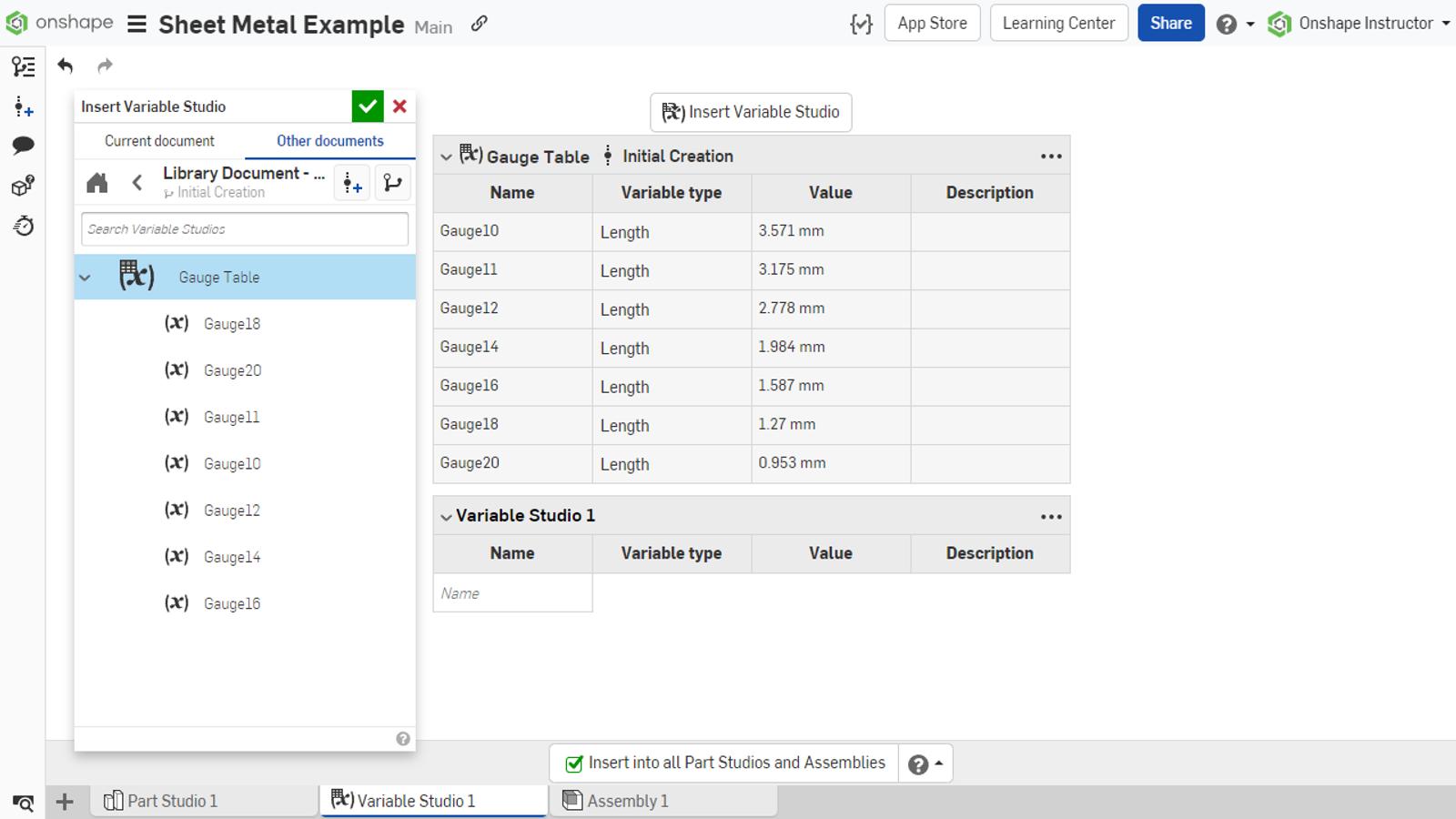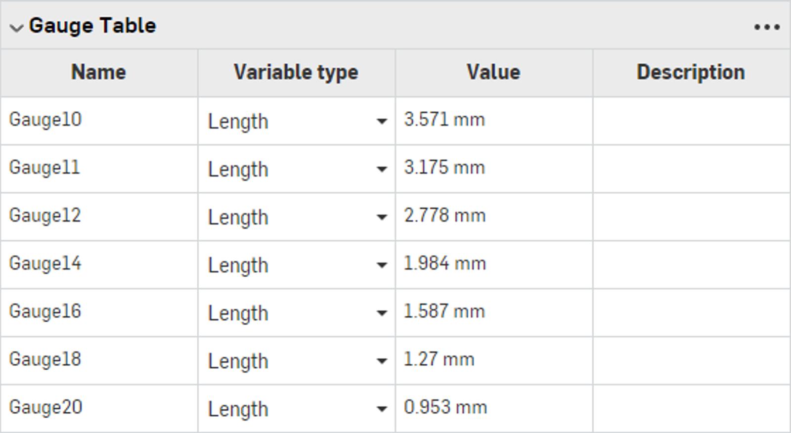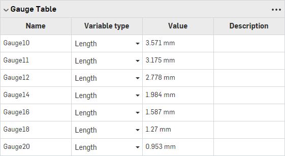 By linking this data to Variable Studios within a library document, the sheet metal data may be updated as needed. Any designs going forward use the updated data, and any old designs are updated to reflect the new values.
