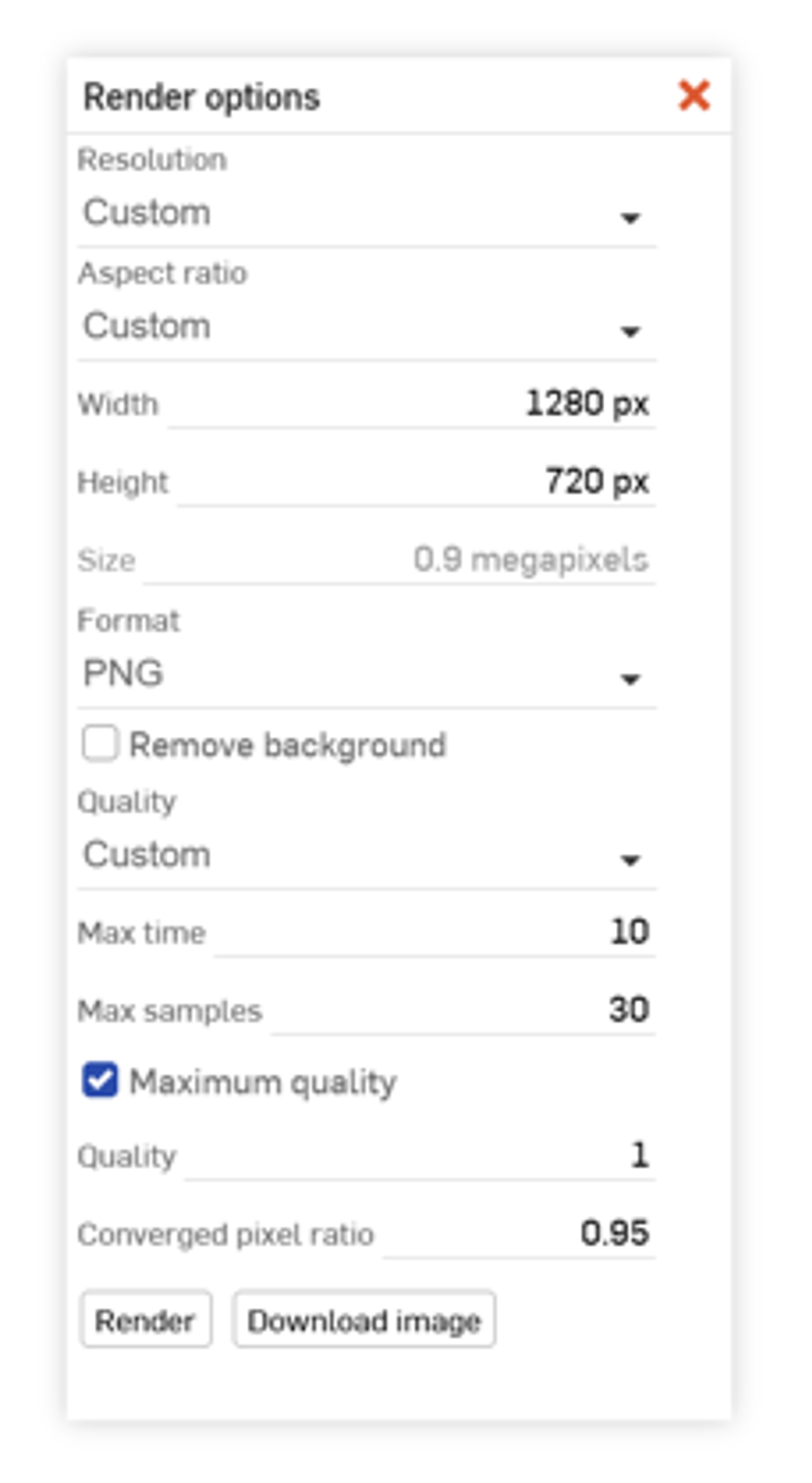 Render option settings are remembered from the latest render. Settings are retained after the page is refreshed and after logging out and back in. These settings are tab specific.