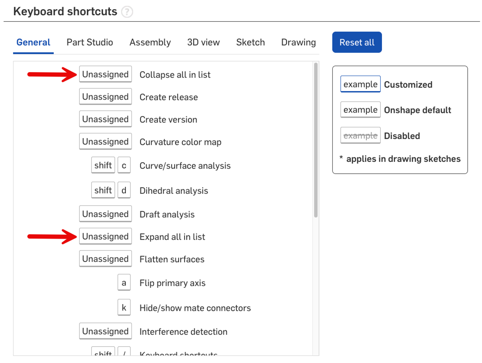 Keyboard shortcuts can be assigned to Collapse all in list and Expand all in list.