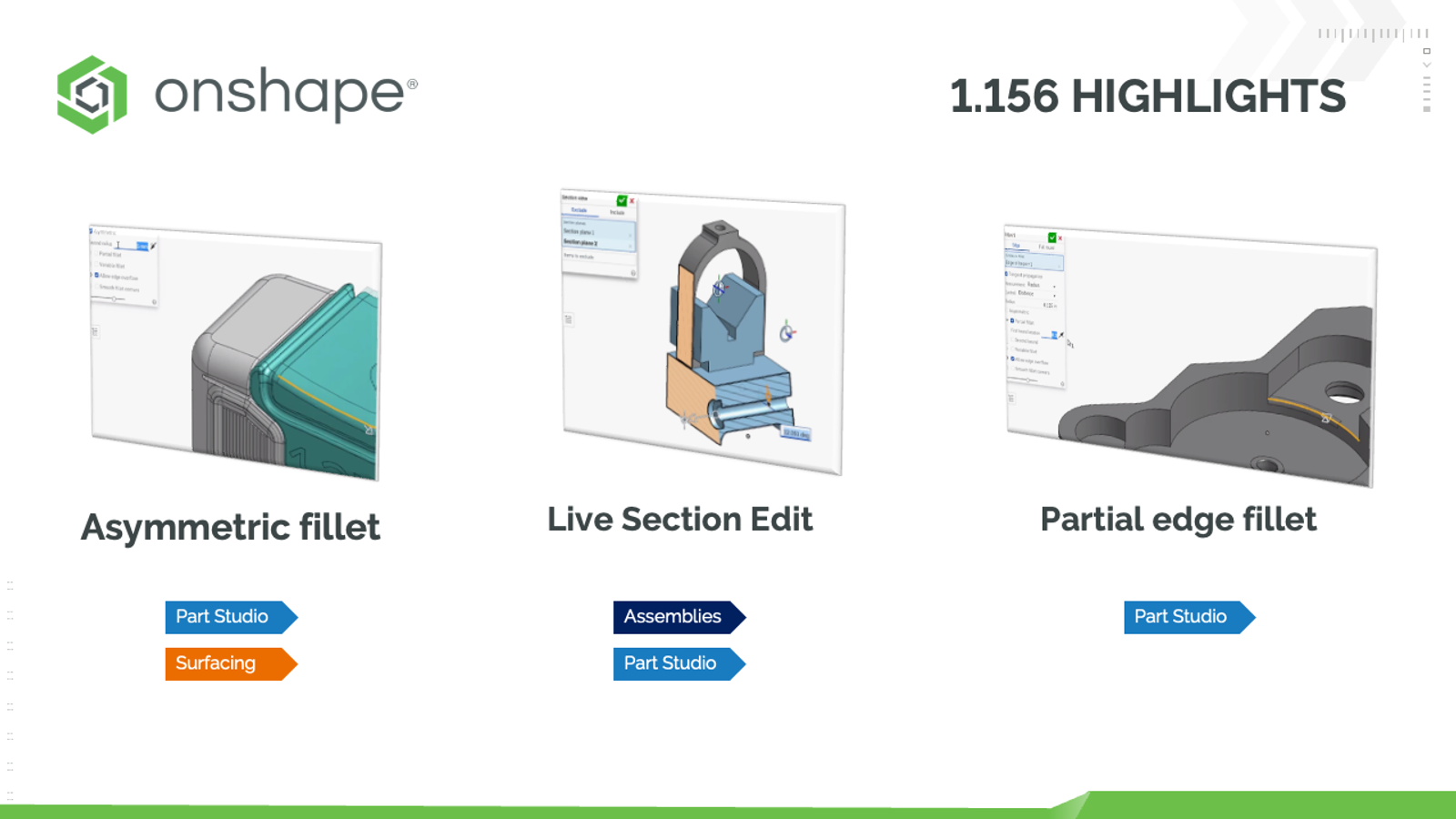 In this latest update, we have improved multiple aspects of Onshape. Many of these updates have been driven by the improvement requests sent in by you, our customers.