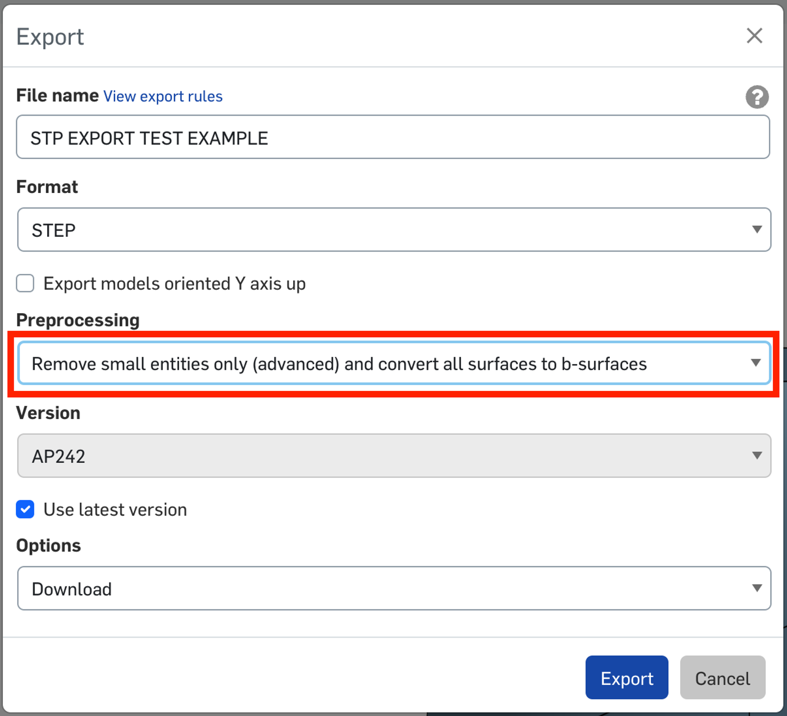 A new Preprocessing option is now supported for STEP file format export. This option is the same as the Remove small entities only (advanced) option, with the additional step where all surfaces are converted to b-surfaces.
