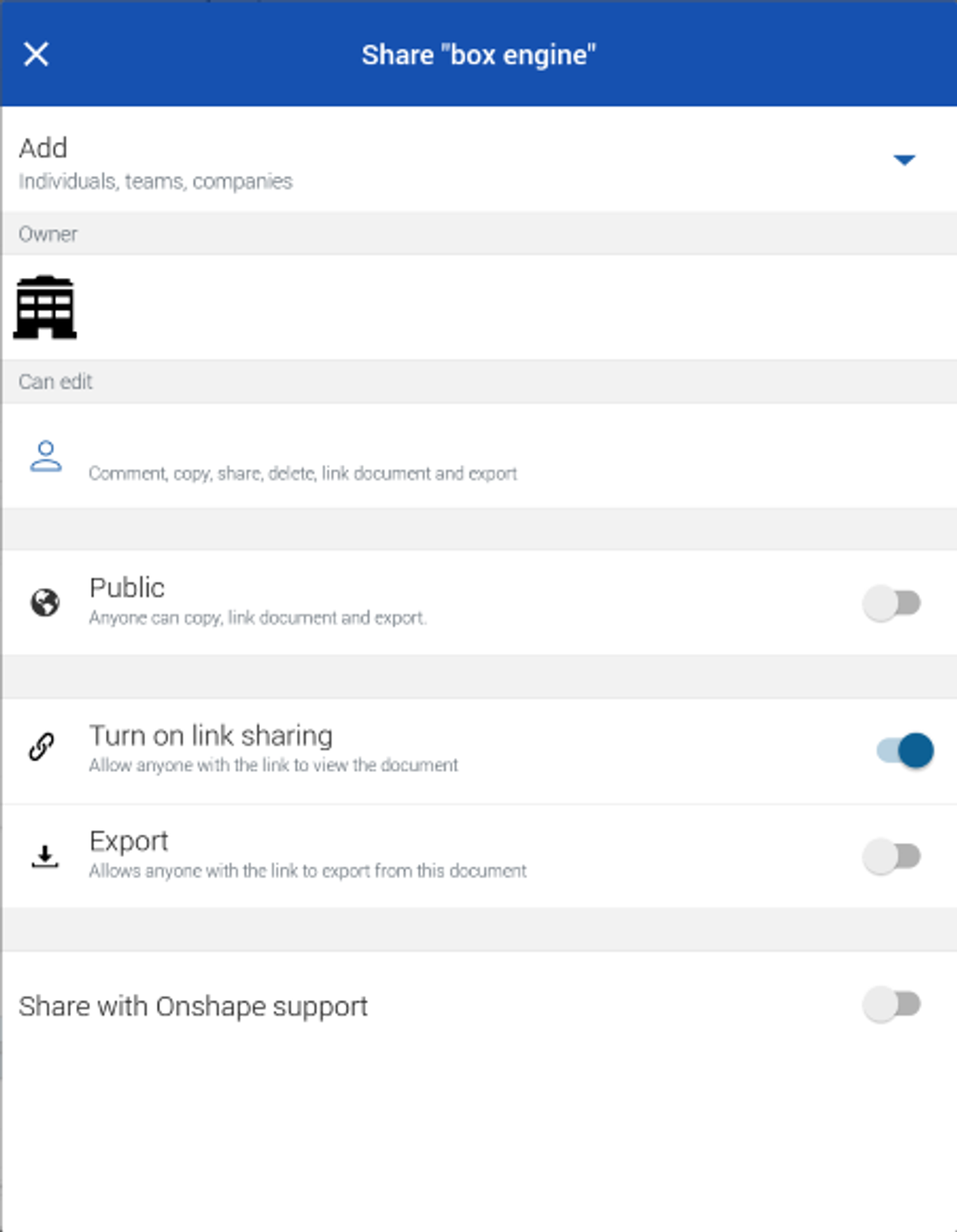 The Onshape Android application now allows you to toggle link sharing permissions.