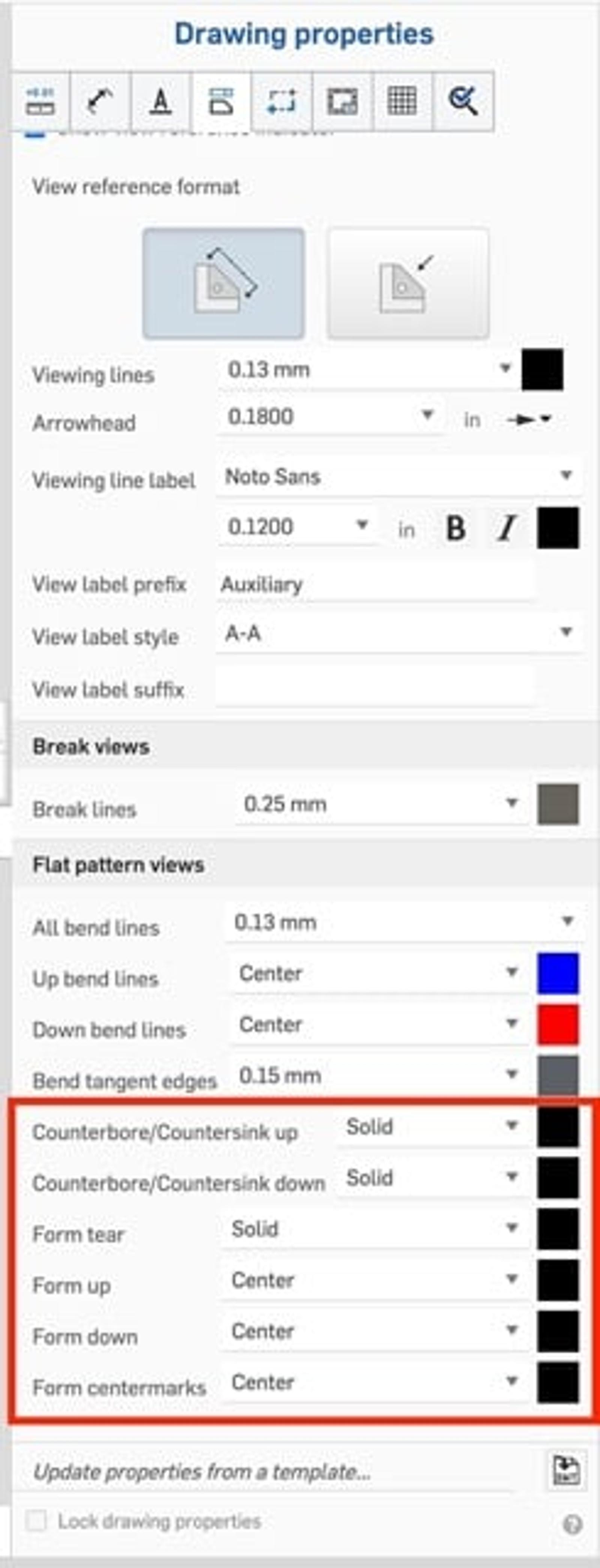 In the Drawing properties, under views, you will now find several additional controls for the line styles and colors of different sheet metal features in your flat pattern views.