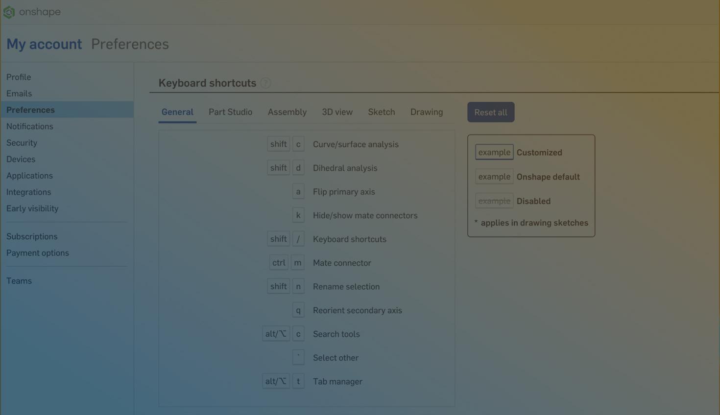 You can now customize keyboard shortcuts in Onshape. Initially, only commands with default keyboard shortcuts assigned can be customized.