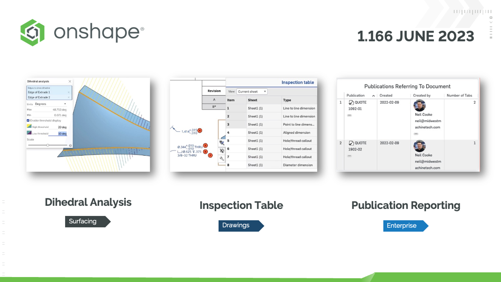 Please take a moment to try out these new features and improvements and leave your comments in the Onshape Forums post. For a detailed list of all the changes in this update, please see the changelog.