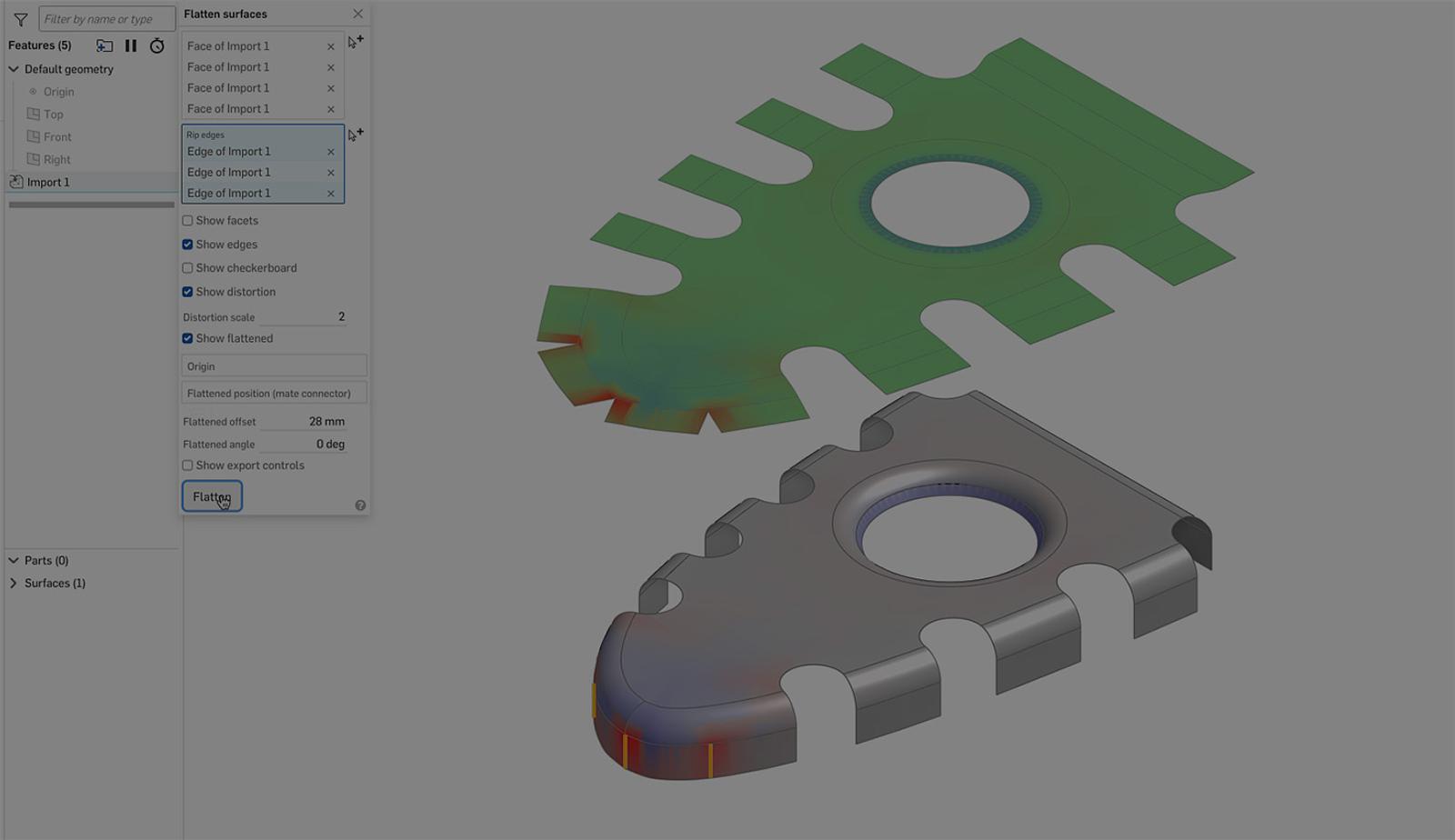 Flatten surfaces is a new Analysis tool that generates a planar surface from one or more contiguous non-planar surfaces. This is useful to evaluate the flat (cut) shape for a paint mask, decal, or text curves. The result can be exported to PARASOLID, STL, DXF, or SVG file format.